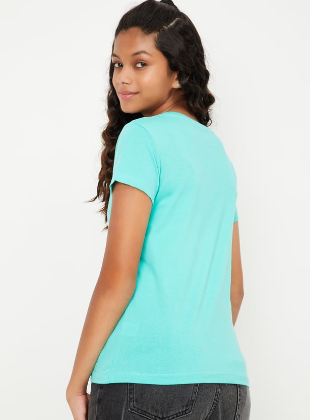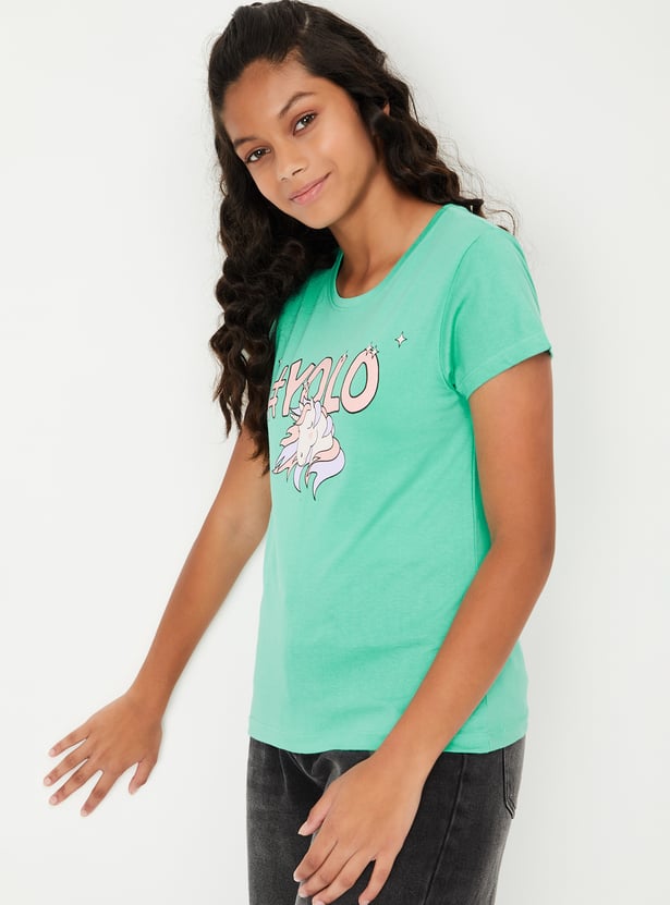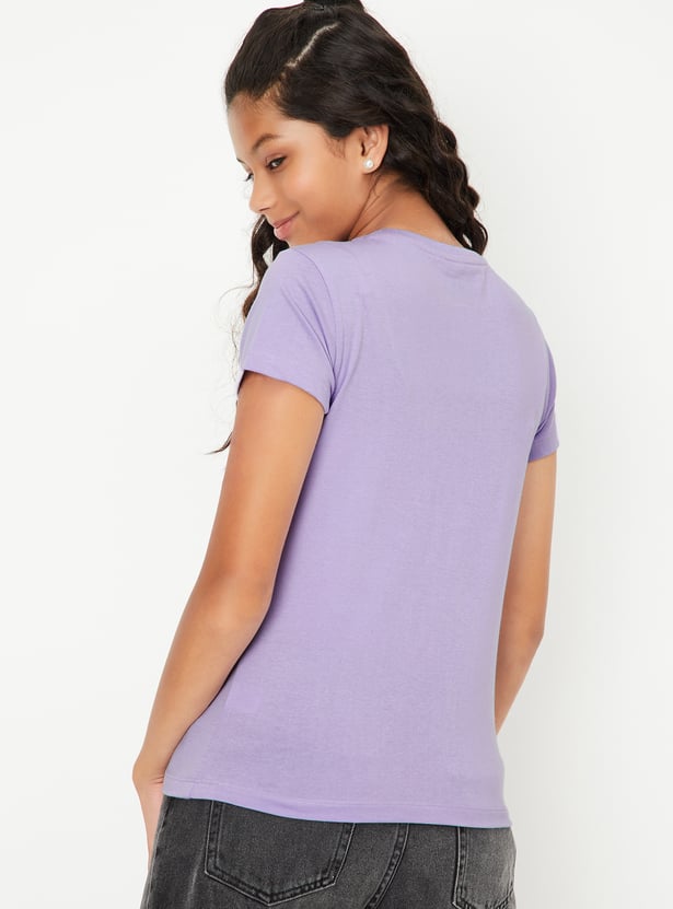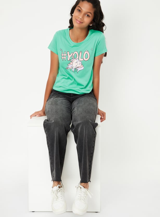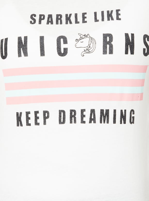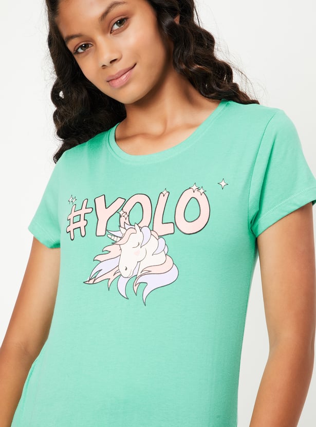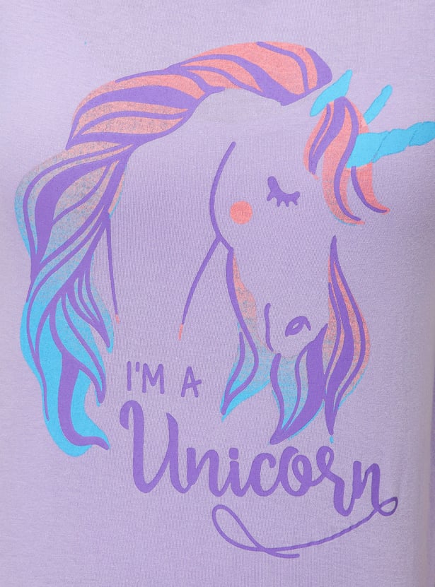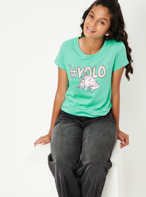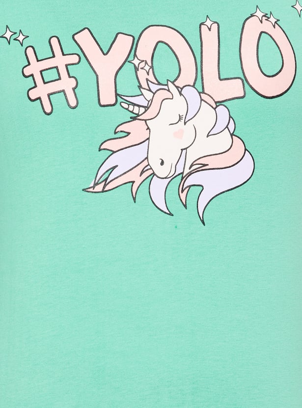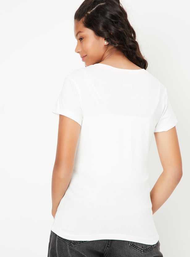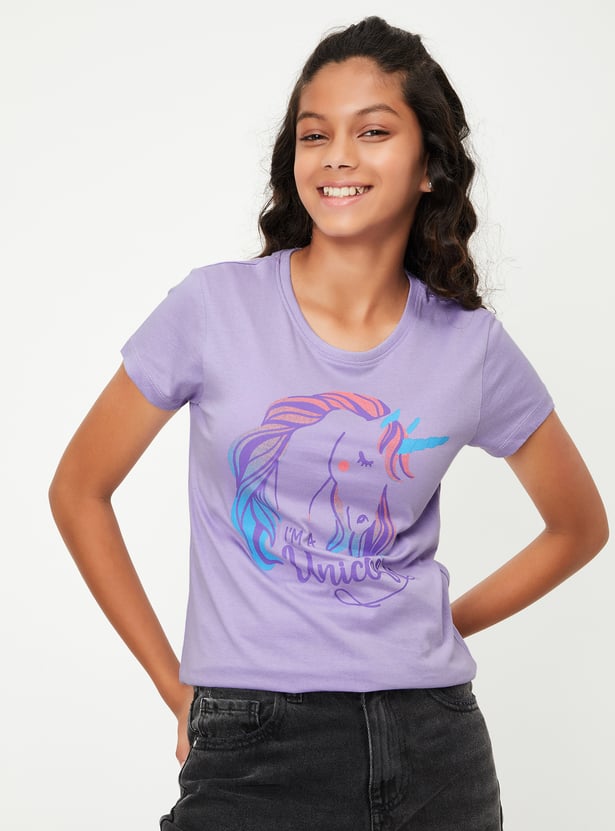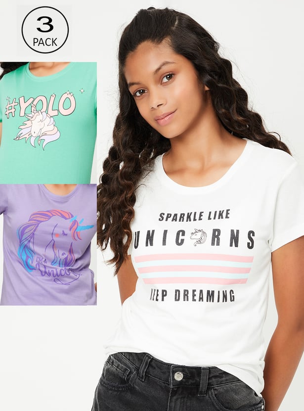 Upgrade her wardrobe with this set of T-shirts. Each of the three T-shirts in the set features a unique graphic print, a round neck, and half sleeves, providing a range of stylish options for her everyday wear.