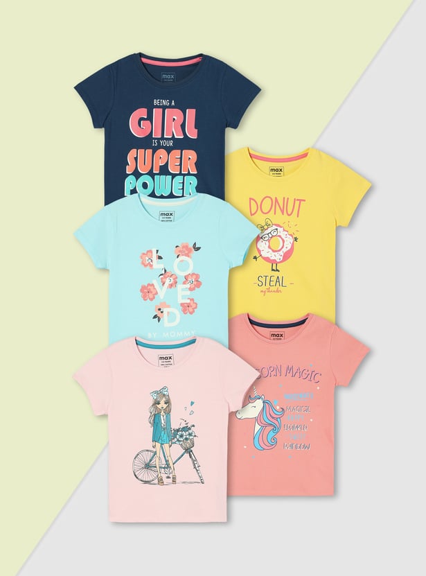 Refresh her casual wardrobe with this set of T-shirts. Featuring five tees with assorted graphic prints, each one has a round neck and half sleeves, offering a stylish and comfortable addition to her everyday outfits.