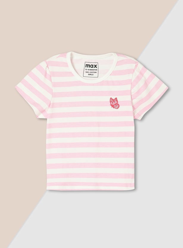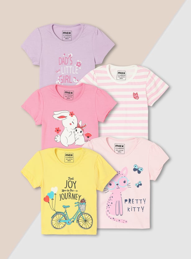 Spruce up her casual wardrobe with this set of T-shirts. It includes five tees with assorted graphic prints and colours, each featuring a round neck and half sleeves.