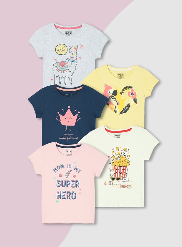 Refresh her casual wardrobe with this set of T-shirts. Featuring five tees with assorted graphic prints, each one has a round neck and half sleeves, offering a stylish and comfortable addition to her everyday outfits.