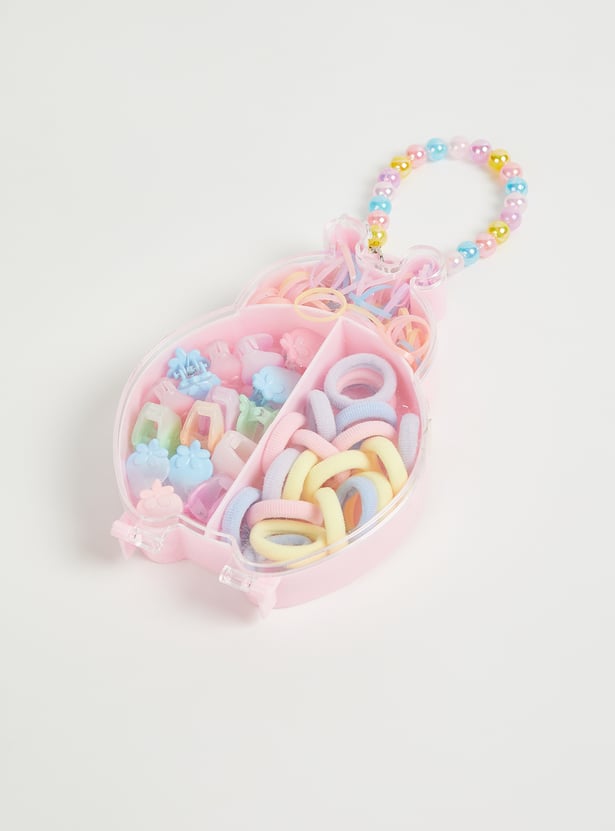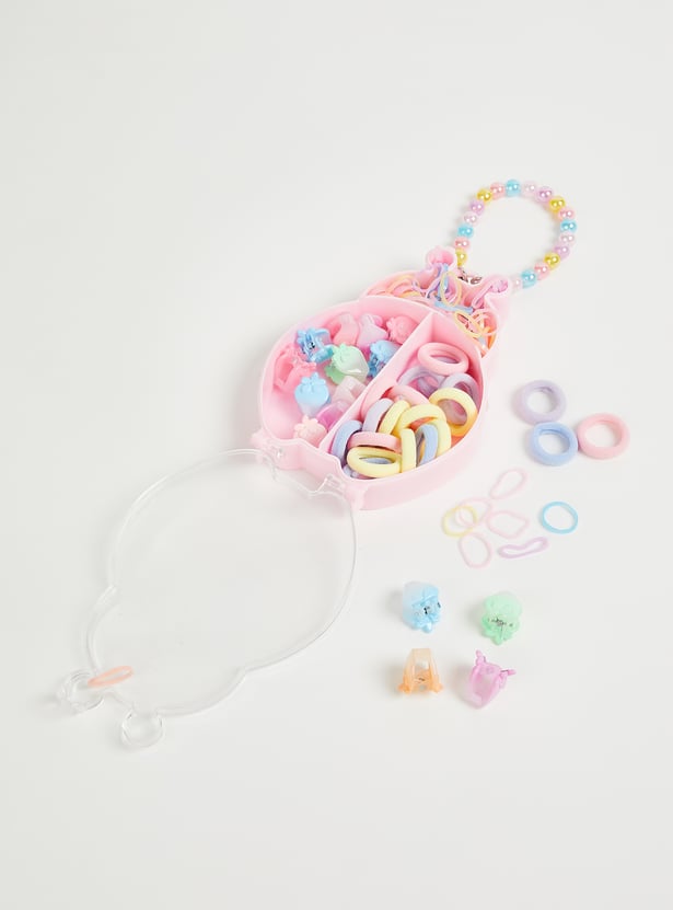 Organize your essentials in style with this accessory set. It includes claw clips and hair bands neatly stored in an accessory box featuring compartments for easy arrangement and a beaded handle for a charming touch.