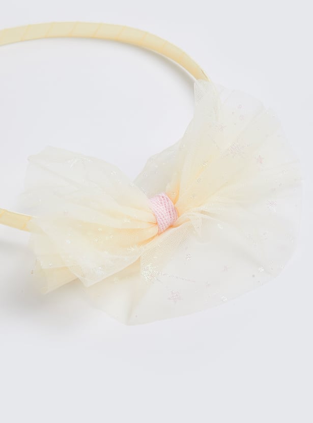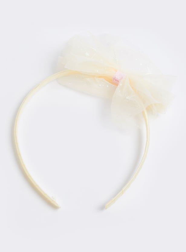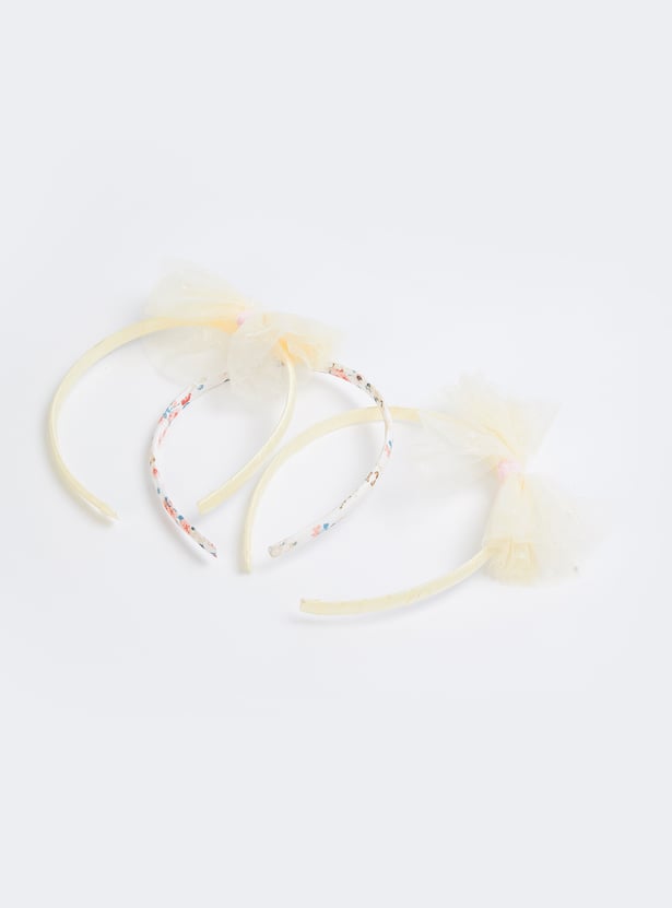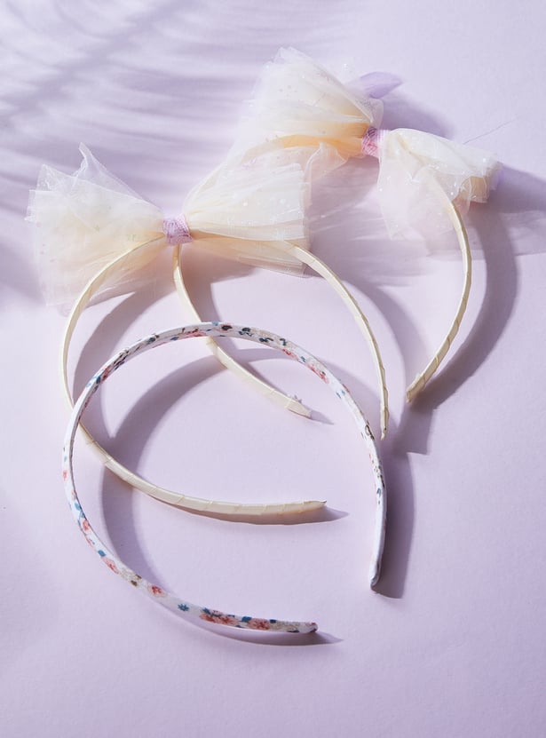 Add a charming touch to your accessories collection with this pack of 3 headbands. Featuring a mix of bow, and printed designs, each headband offers a unique style to match any outfit.