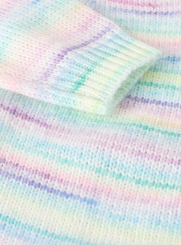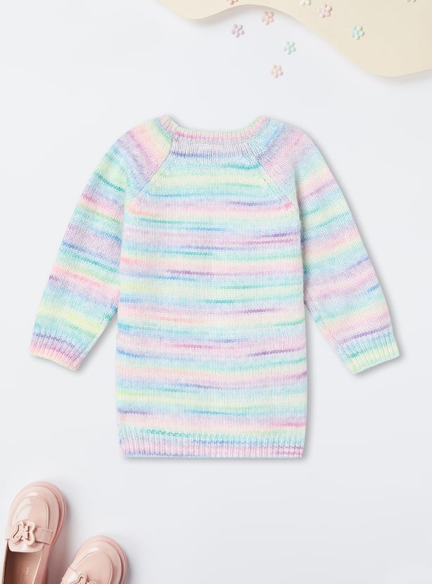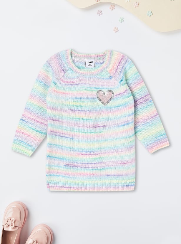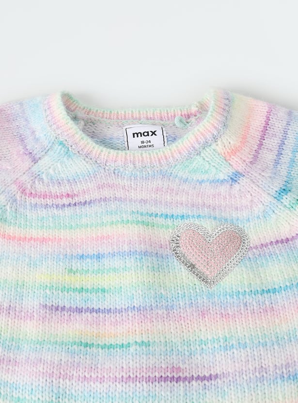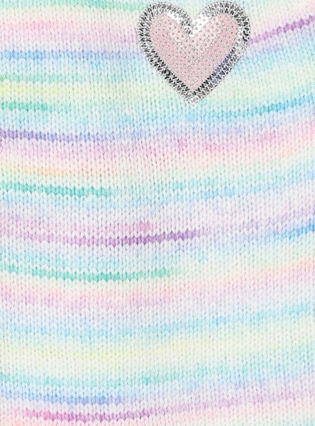 Add a pop of colour and sparkle to her day with this sweater. The sequinned heart at the chest and a vibrant multicolour knit design make it a standout piece. The raglan sleeves offer a relaxed fit, while the round neck and ribbed trim complete the look.