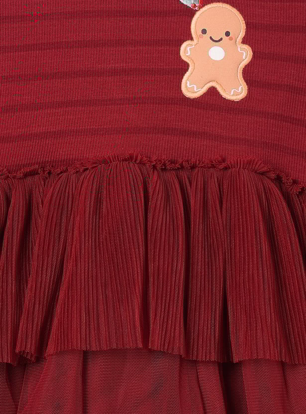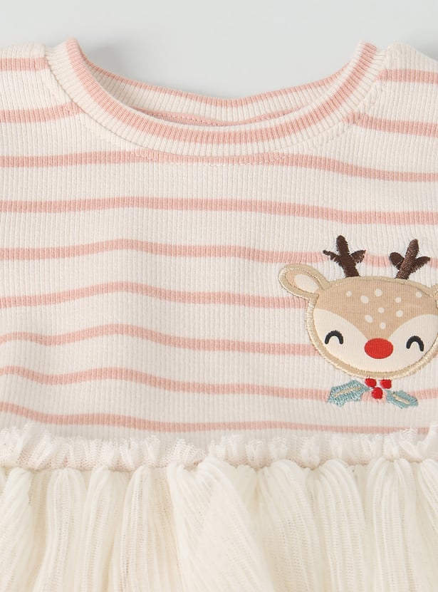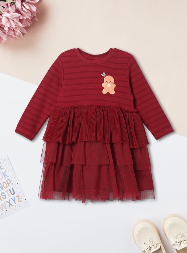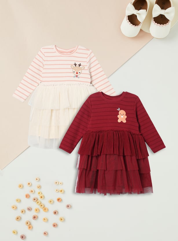 Add playful charm to her wardrobe with this pack of two layered dresses. Featuring a round neck and full sleeves for comfort, each dress is styled with stripes on the top layer, giving a trendy contrast to the flowy silhouette