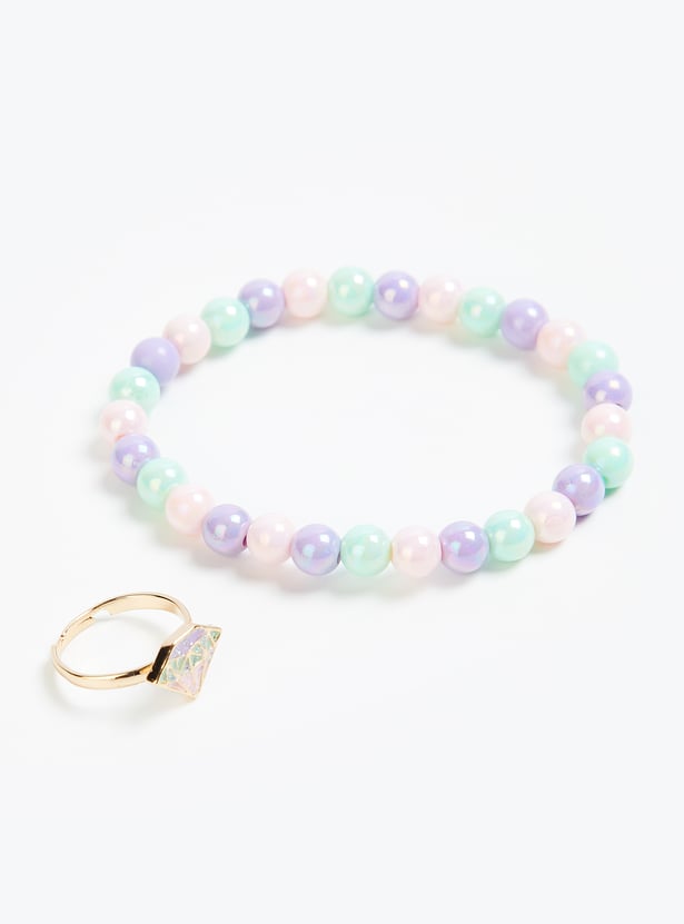 Indulge your little one's sweet tooth with this delightful jewellery set. Featuring a diamond-shaped pendant necklace with a secure lobster closure, a charming beaded bracelet, and an adjustable ring, it's the perfect accessory for adding a touch of whimsy to any outfit. Watch your child shine with cuteness and style.