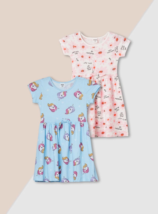 Brighten up her everyday style with this pack of 2 printed A‑line dresses featuring a classic round neck and half sleeves. Crafted from soft, breathable fabric, these dresses offer a comfortable fit with a playful, twirl‑friendly silhouette.