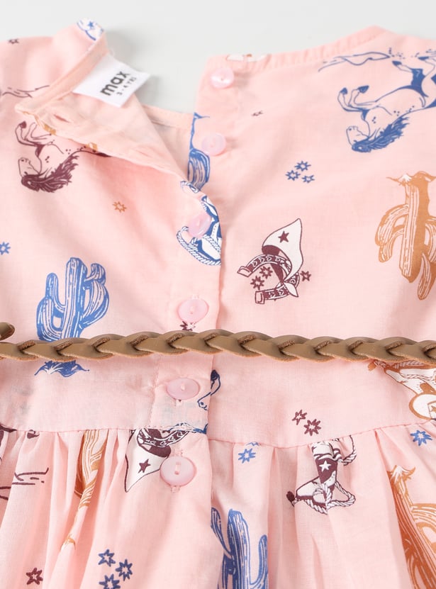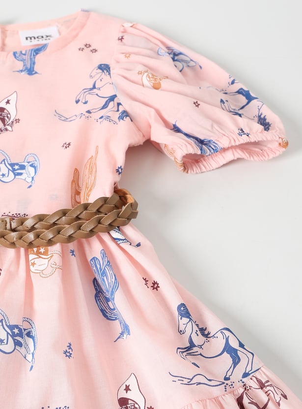 Refresh your wardrobe with this pack of printed dresses, designed with a classic round neck, puff half sleeves, and button closure for easy wear. One dress features a stylish back tie-up detail, while the other comes with a braided belt for a flattering fit.