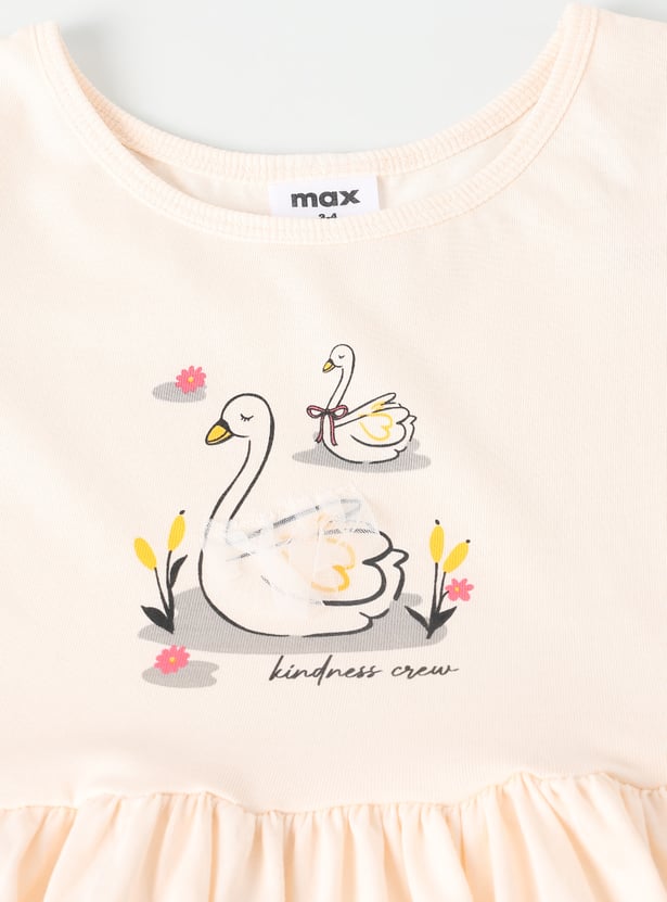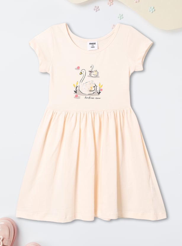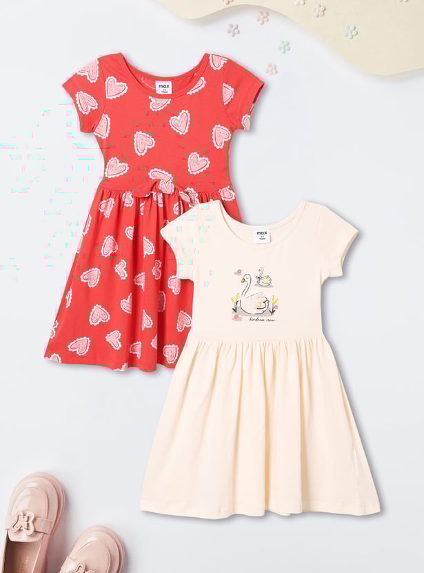 Add sweet charm to her everyday styling with this pack of 2 printed dresses, designed for comfort and playful style. Featuring a round neck, half sleeves, a bow detail at the waist, and assorted prints, they offer a cute and comfortable fit for daily wear.