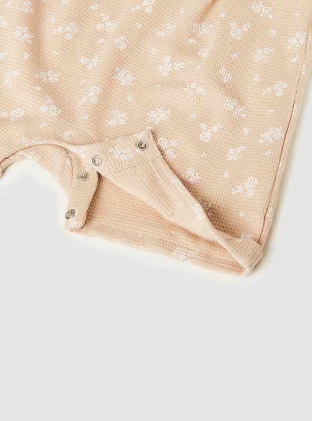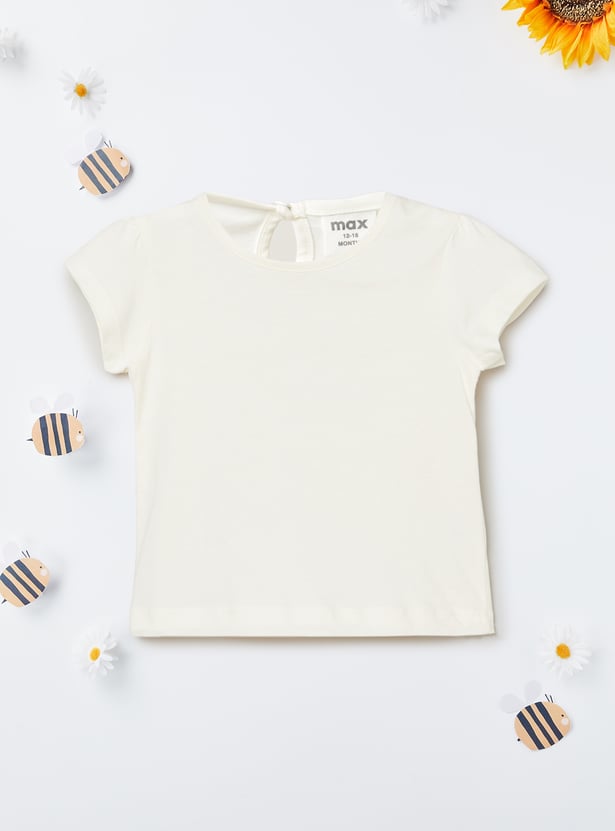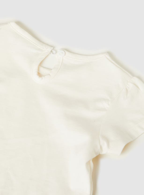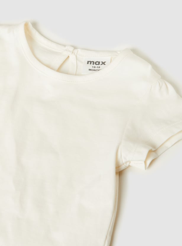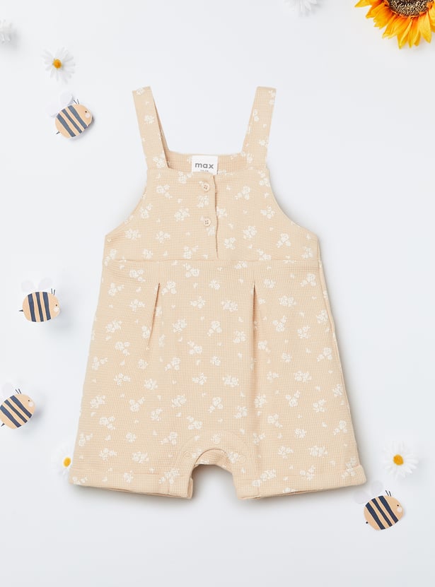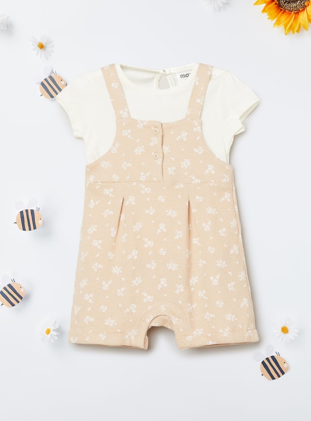 This cute set features a printed dungaree with shoulder straps and button closures, paired with a comfortable printed T-shirt with a round neck and half-sleeves.