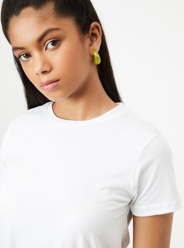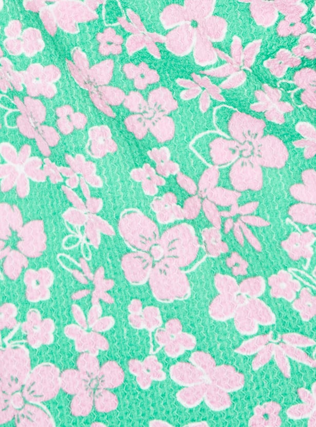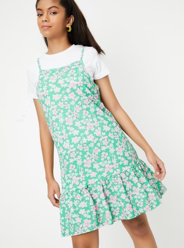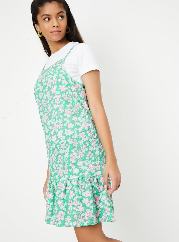 Induce comfort and style with this printed pinafore dress accentuated with a square neckline, spaghetti straps, and a solid under-layering t-shirt with a round neckline and short sleeves.