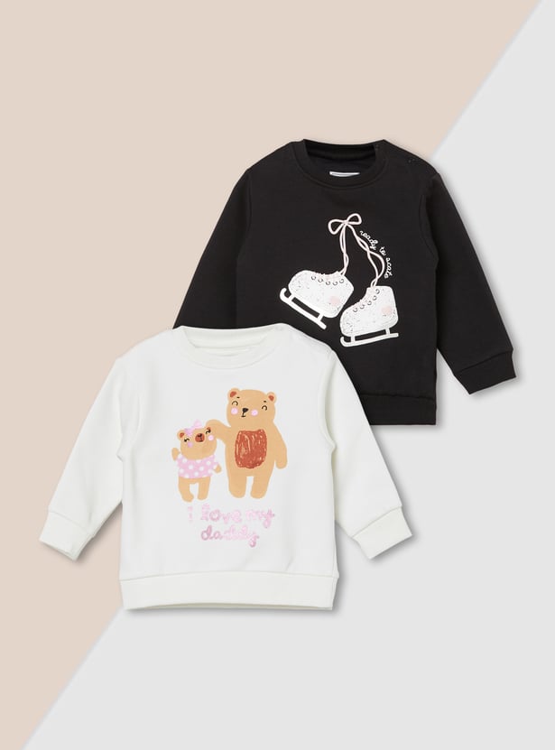 This pack of 2 printed sweatshirts for girls features round necks, full sleeves, and ribbed hems for a snug fit. Perfect for casual days, they combine comfort with playful style.