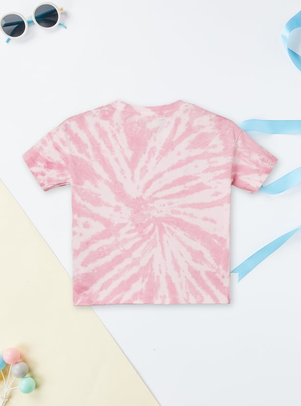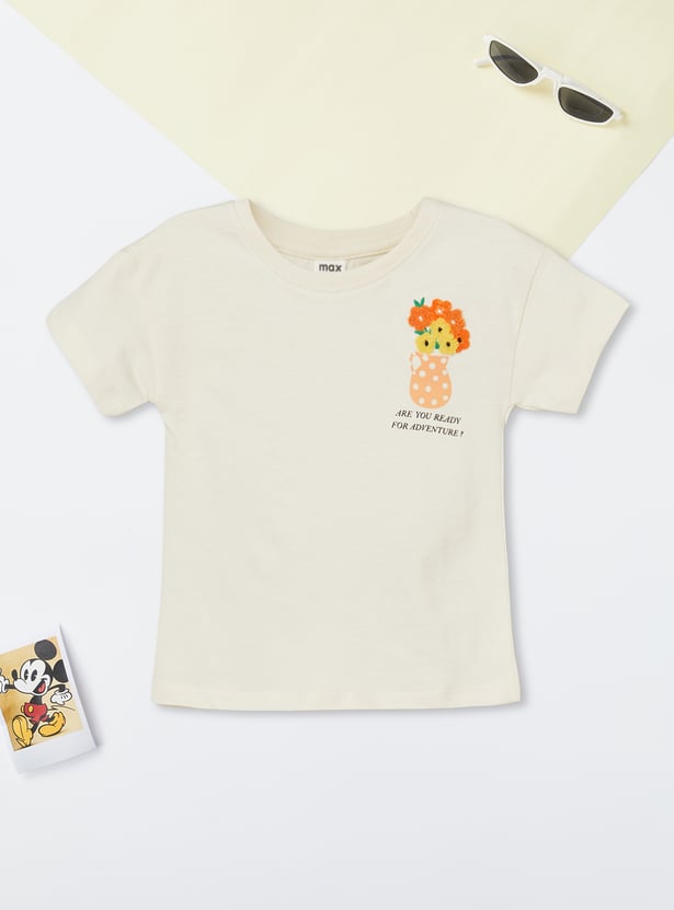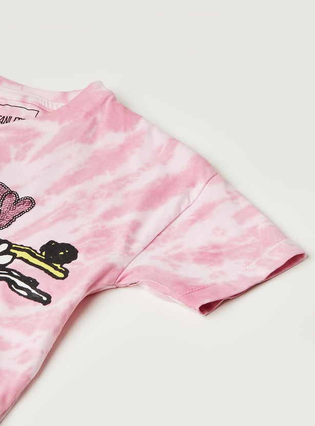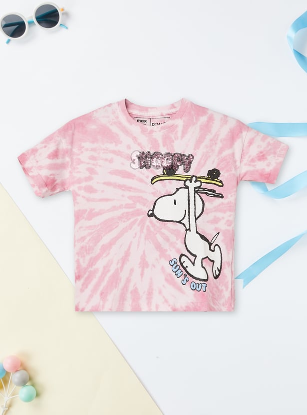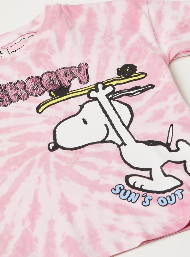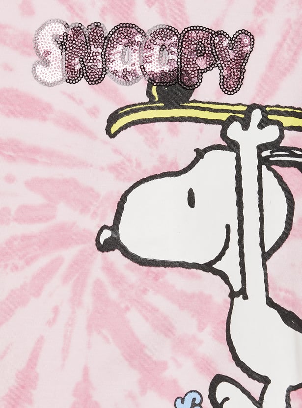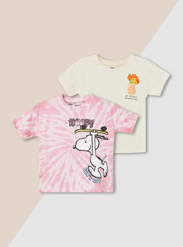 This pack of 2 girls’ printed T-shirts adds a fun twist to casual dressing. One features a playful Snoopy print with sequin detail, while the other comes with a simple printed design. Both have a round neck and half sleeves for everyday comfort.