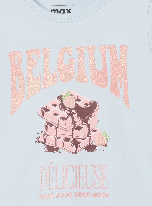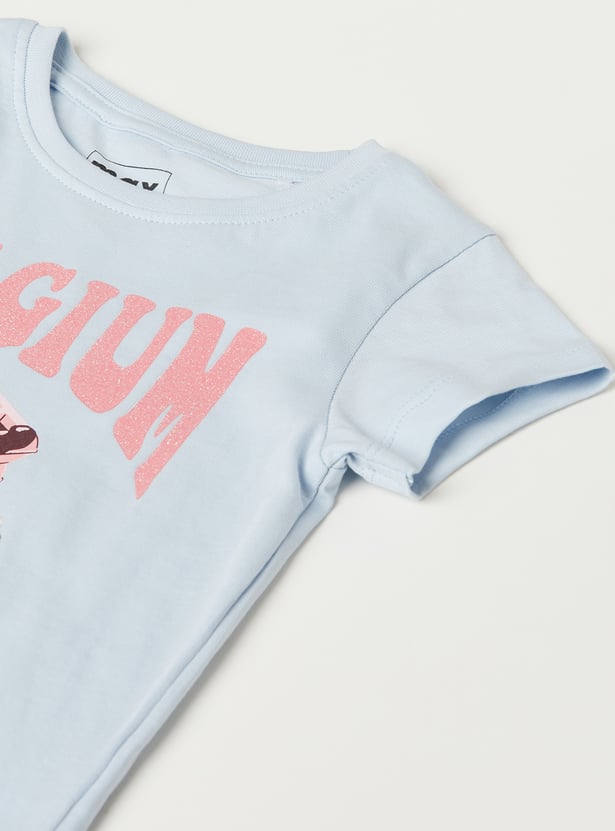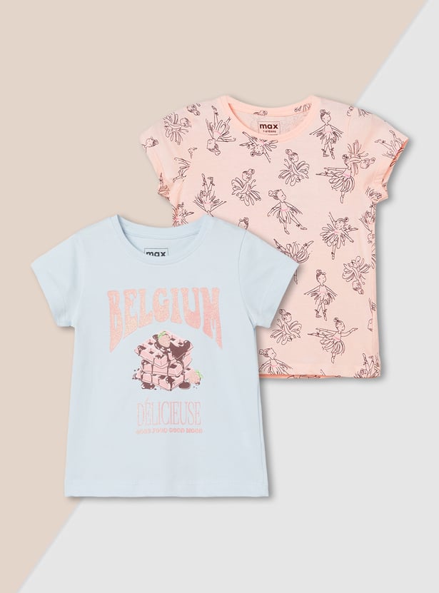 This pack of 2 girls’ printed T-shirts brings easy comfort and playful charm to her wardrobe. Designed with a round neck and half sleeves, each tee features cheerful prints perfect for everyday wear.