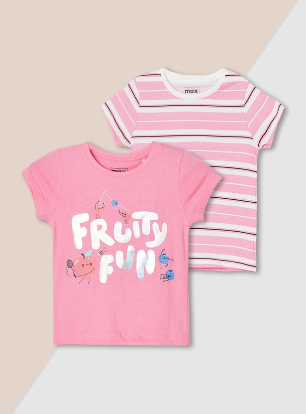 Update your everyday essentials with this pack of two printed T-shirts featuring a classic round neck and comfortable half sleeves. Designed for a regular, easy fit perfect for daily wear.