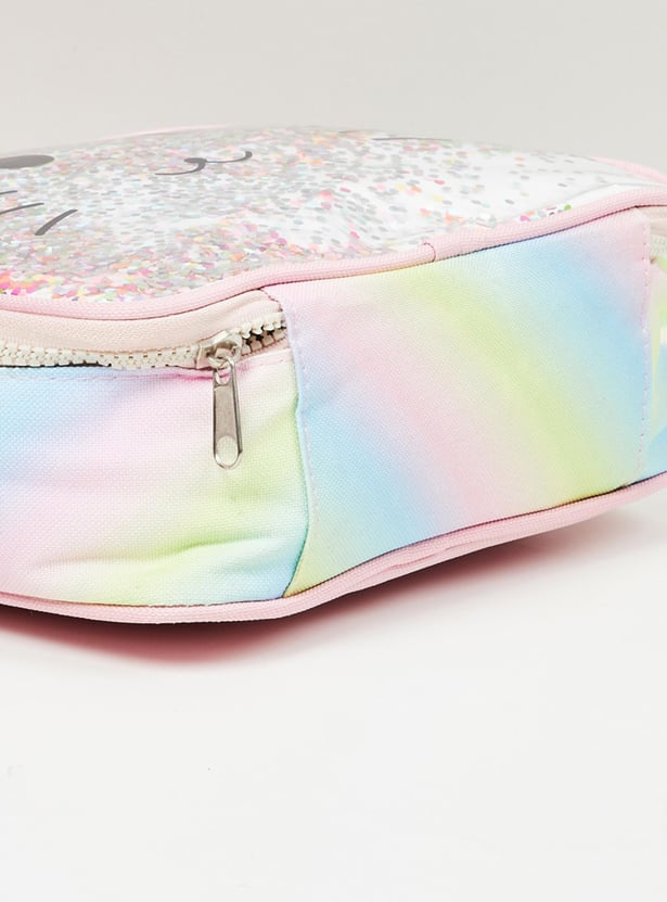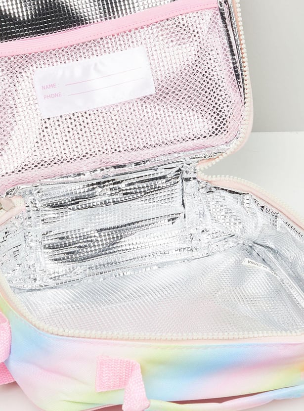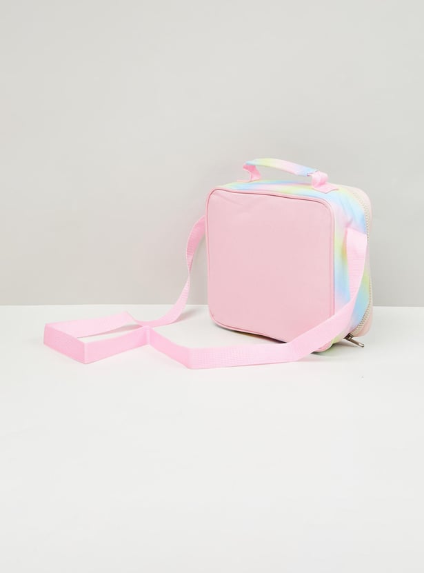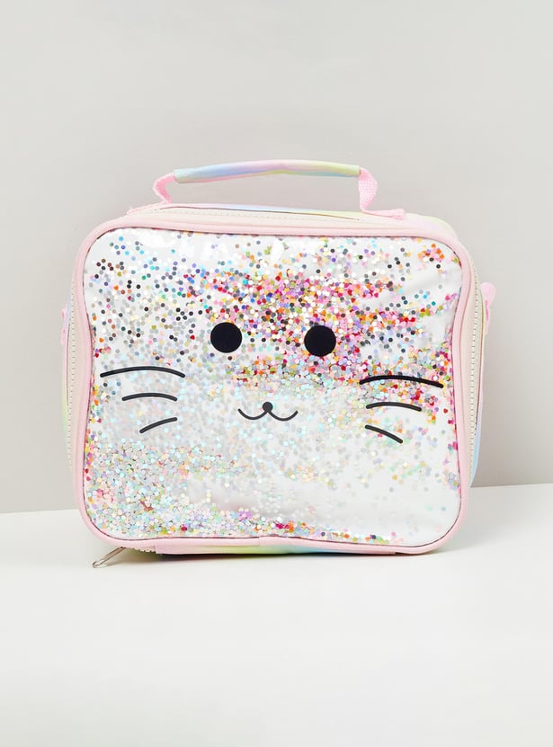 Featuring cat-themed print and embellished detailing, this lunch bag with zip closure, flat handle, and shoulder strap is the perfect school accessory for your little one.