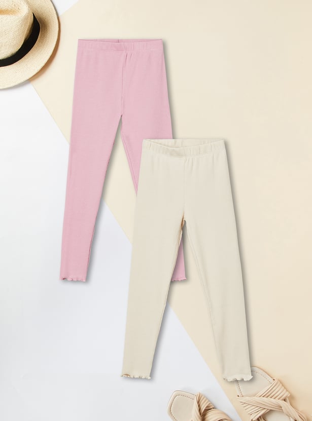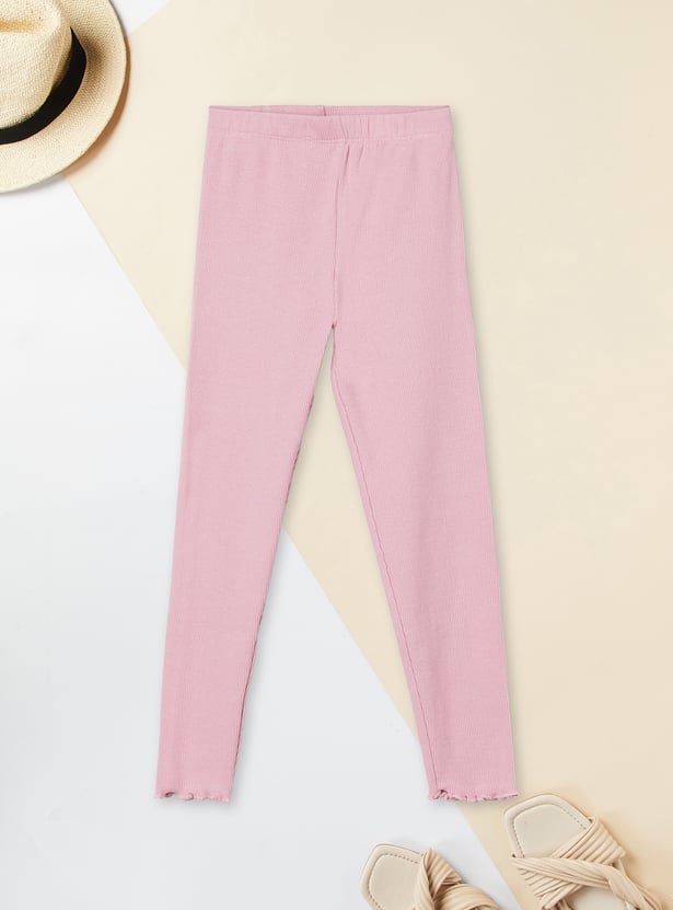 Add a fun pop of style to everyday outfits with these printed leggings. Designed withlettuce edge and a ribbed texture, they offer a snug and comfortable feel for all-day wear. The elasticated waist ensures a flexible, easy fit.