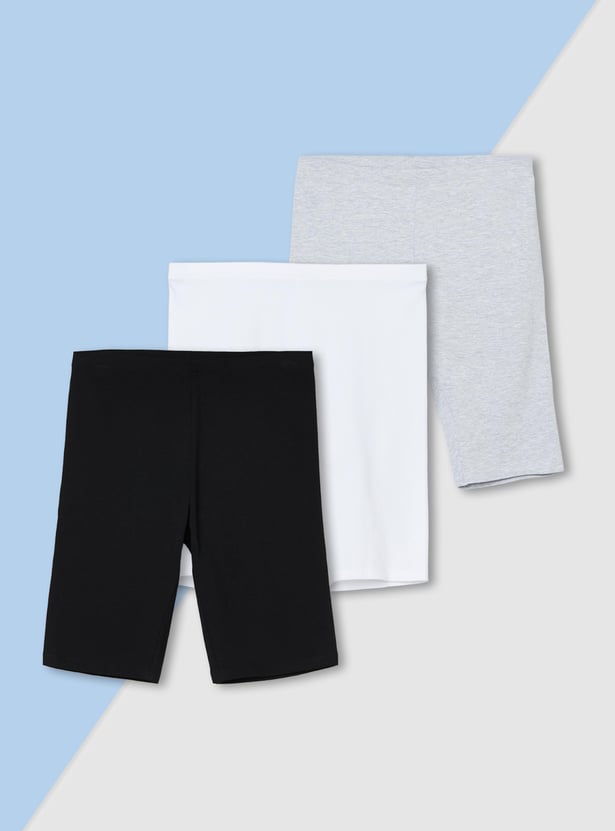 Stay active and comfortable with this pack of three solid cycling shorts, featuring an elasticated waist for a secure and flexible fit. Ideal for workouts or casual athleisure, they combine ease and style effortlessly.
