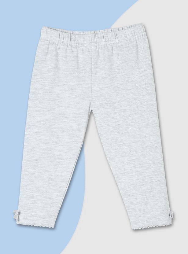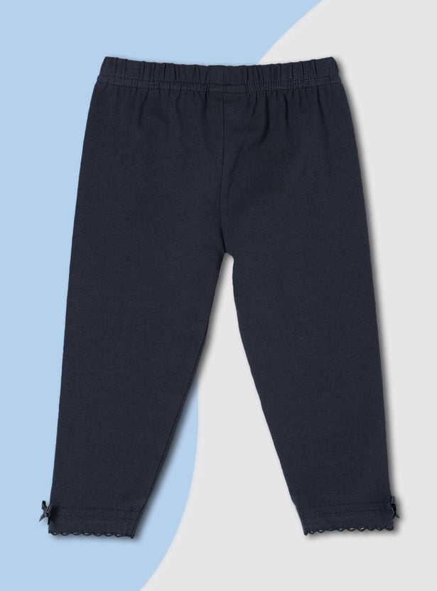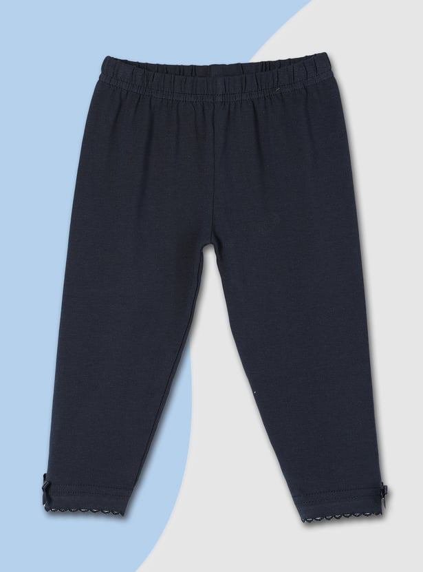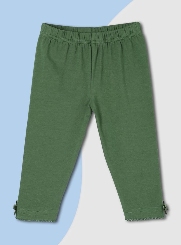 Brighten up her casual style with these leggings. Featuring an elasticated waist, a solid surface, and a charming bow at the hem adorned with lace, they provide a full-length profile that adds a touch of playful elegance and everyday comfort.