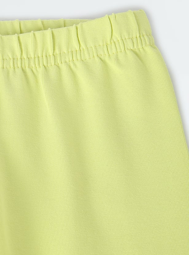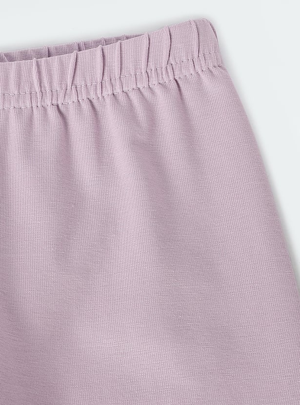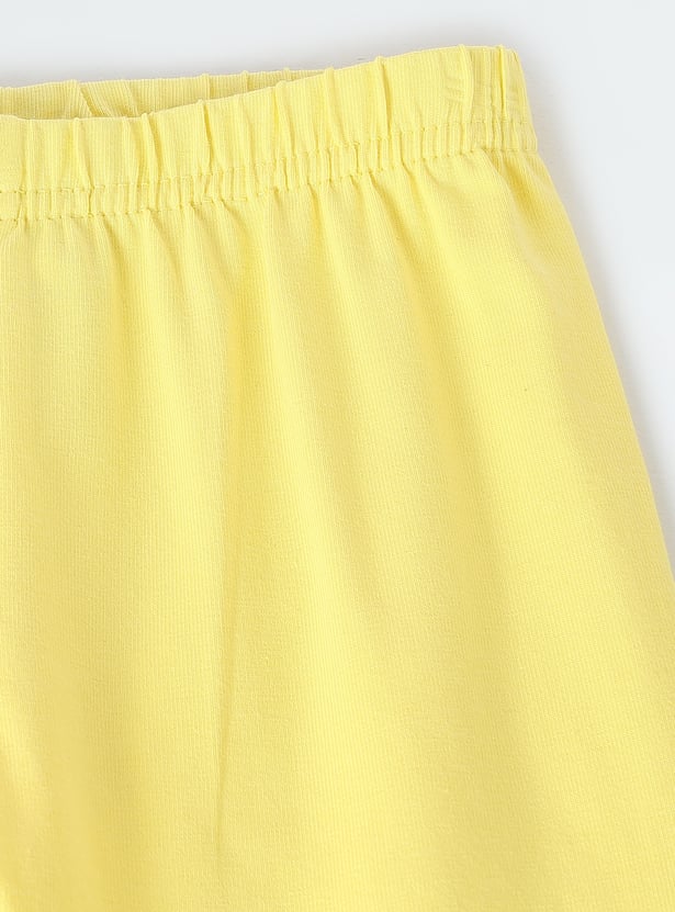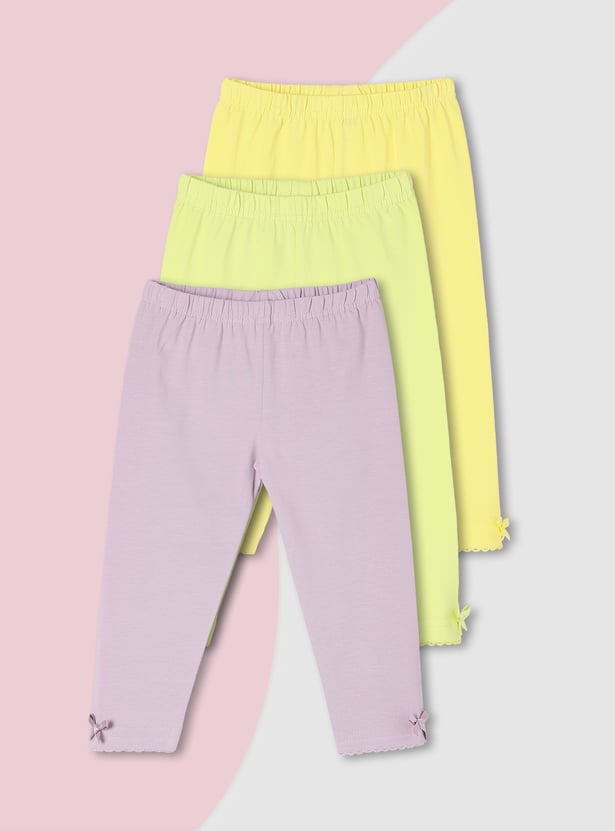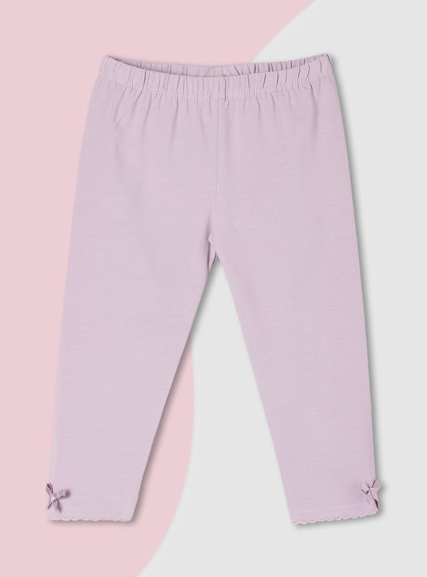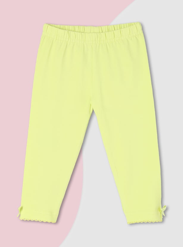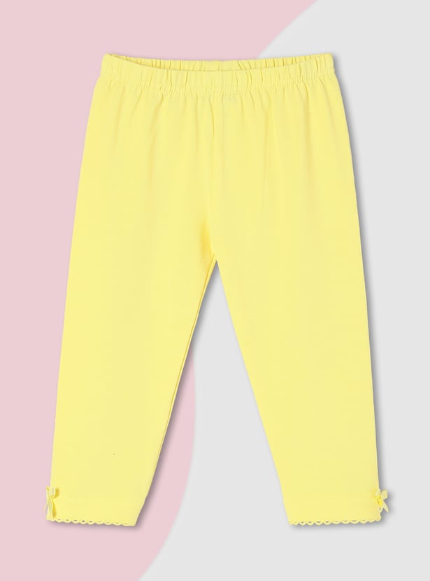 Brighten up her casual style with these leggings. Featuring an elasticated waist, a solid surface, and a charming bow at the hem adorned with lace, they provide a full-length profile that adds a touch of playful elegance and everyday comfort.