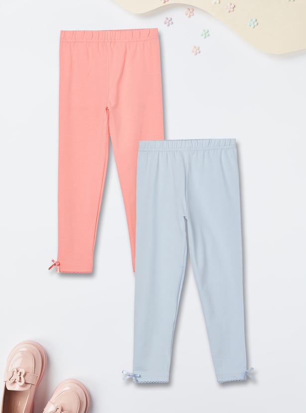 These solid leggings feature an elasticated waist for a comfy fit and cute bow detailing at the hem. Perfect for everyday wear with a touch of charm.