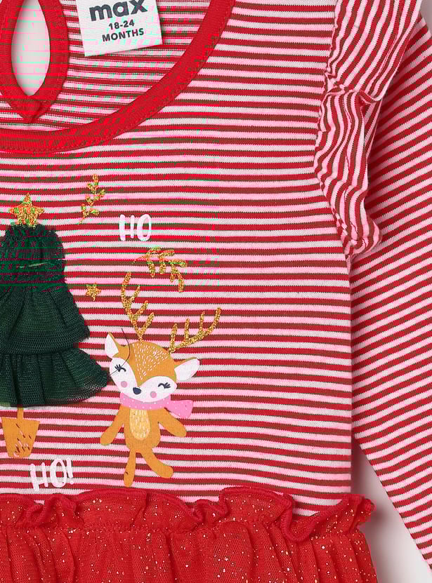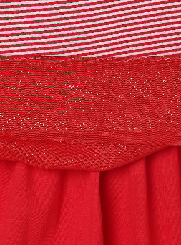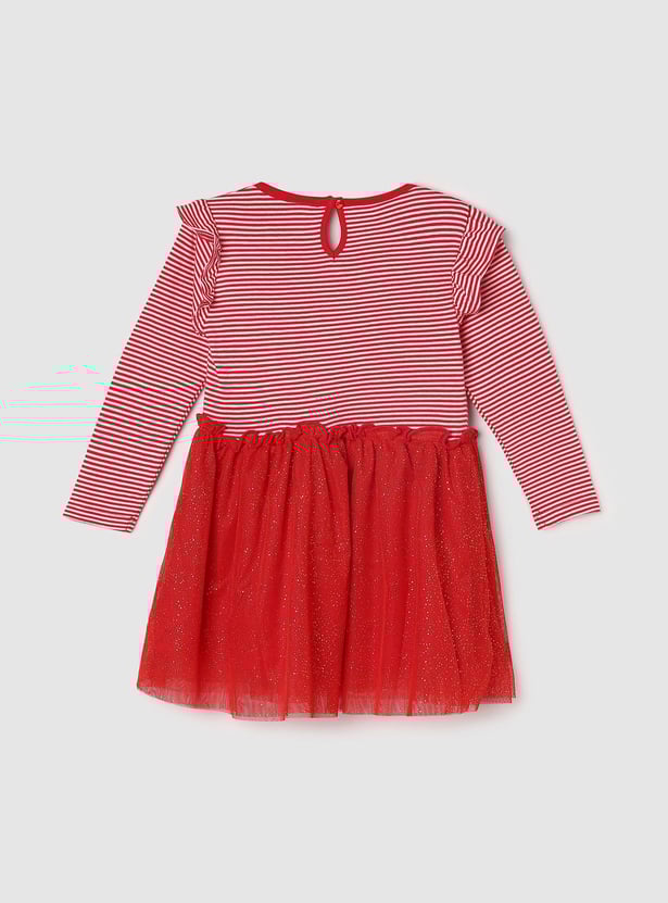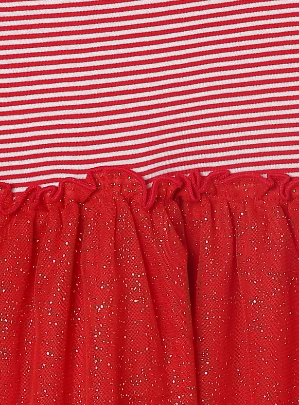 Jazz upper style with this A-line dress featuring a striped bodice, round neckline, long sleeves with ruffled accents, applique detailing, and a shimmery pleated skirt.