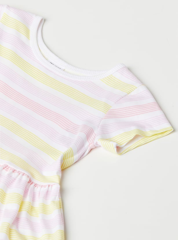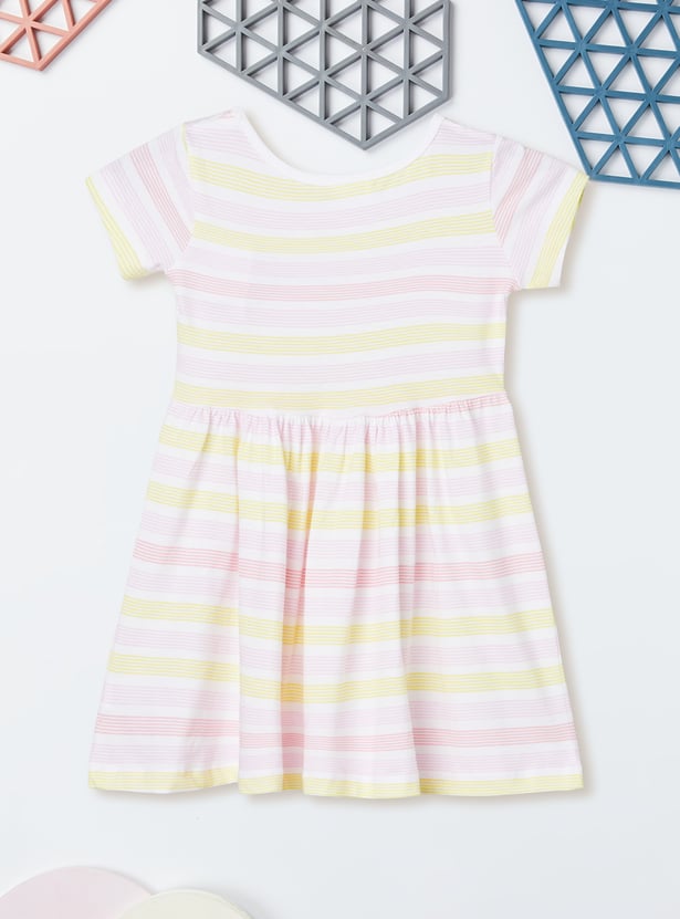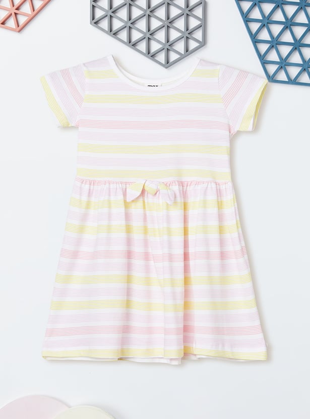 Add a playful twist to your wardrobe with this striped dress, featuring a classic round neck, half sleeves, and a flared skirt for a flattering silhouette. It's a perfect pick for casual outings or weekend wear.