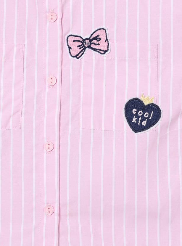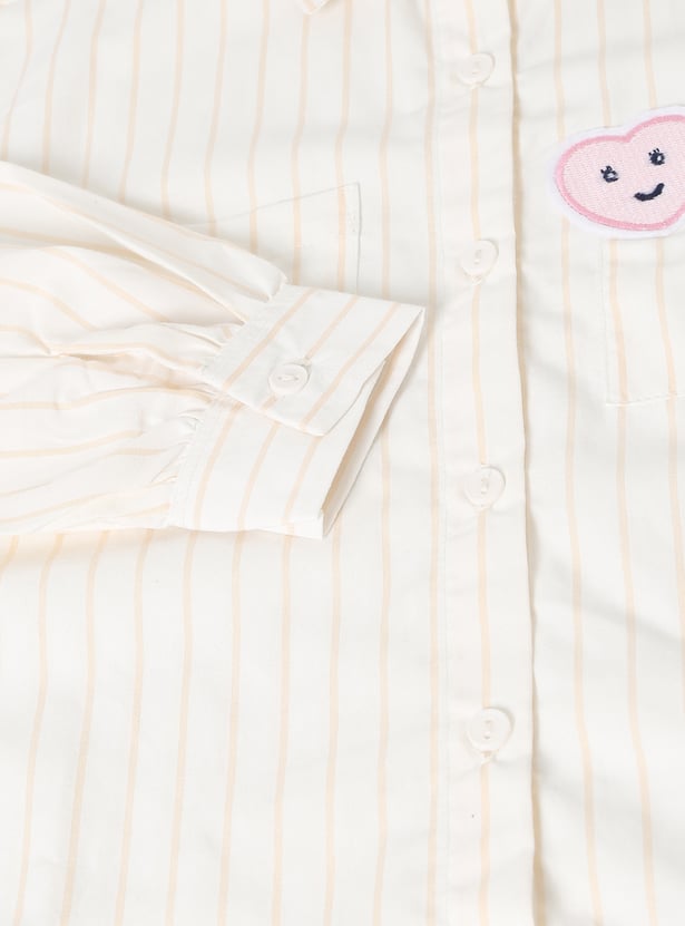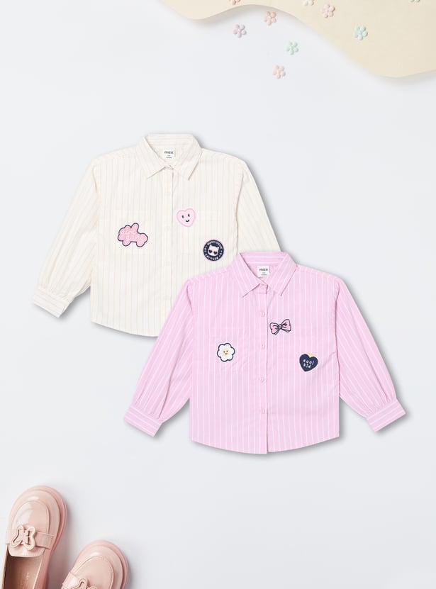Add a smart twist to everyday style with this striped shirt pack. This pack of 2 features a spread collar and full sleeves with buttoned cuffs for a polished look. Designed with stripes and an applique on the chest, they are finished with a curved hem for added style. It includes double patch pockets.
