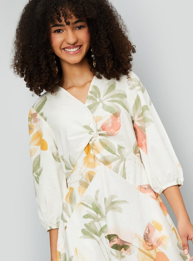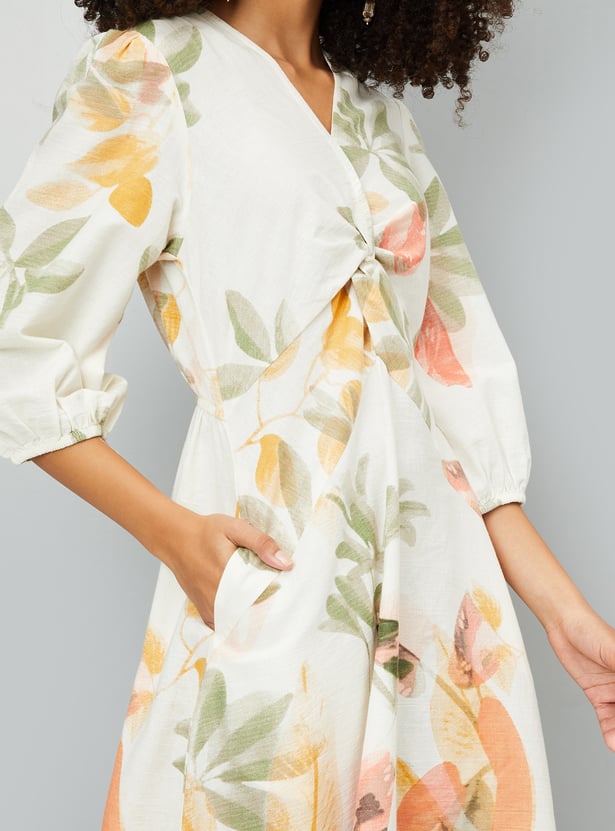 This floral print A-line midi dress features a flattering V-neck, side pocket, and 3/4th sleeves, combining comfort and elegance in one beautiful piece. The A-line cut adds a graceful flow, perfect for any occasion.