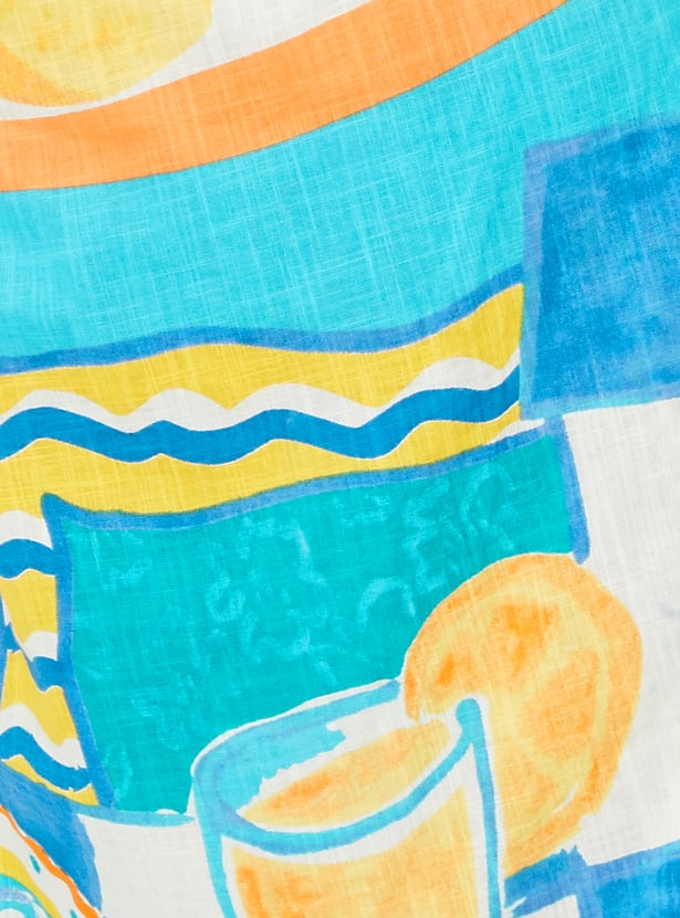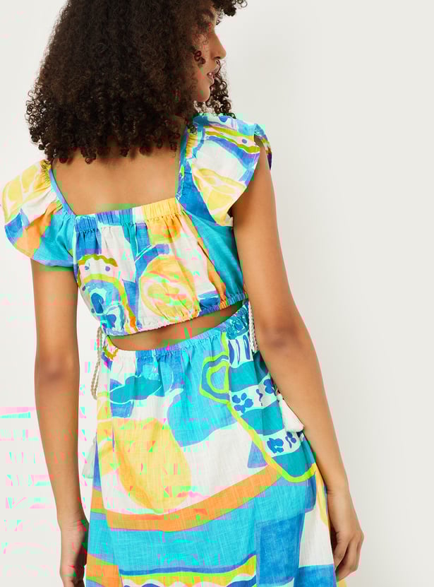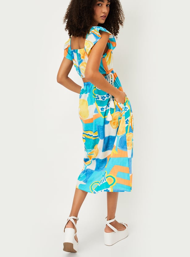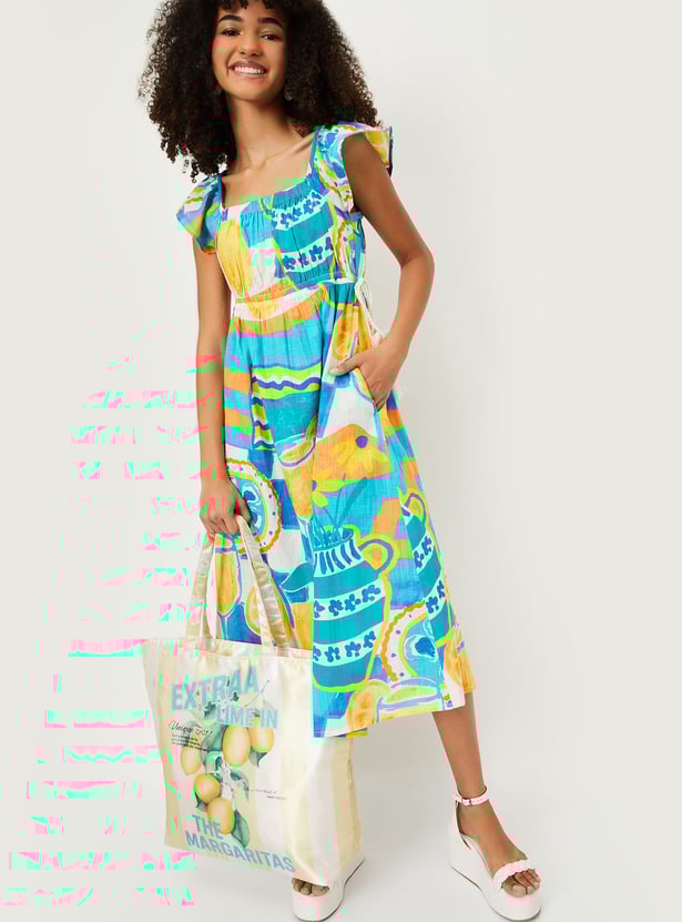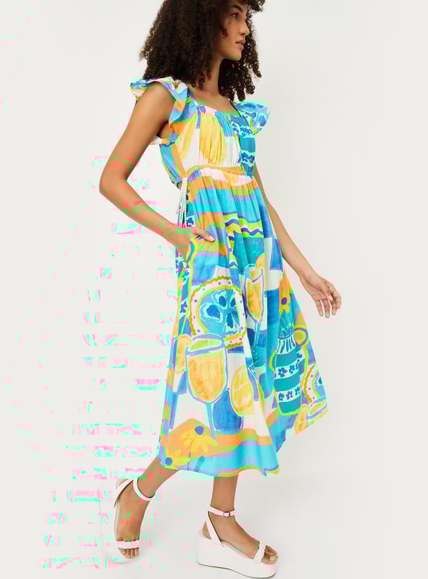 Effortlessly enjoy those warm summer days with this midi-length, A-line dress. Designed with vibrant prints, it exudes vacation-inspired flair. The features include a square neck, ruffled sleeves, waist pockets, and a tie-up at the waist that adds definition.