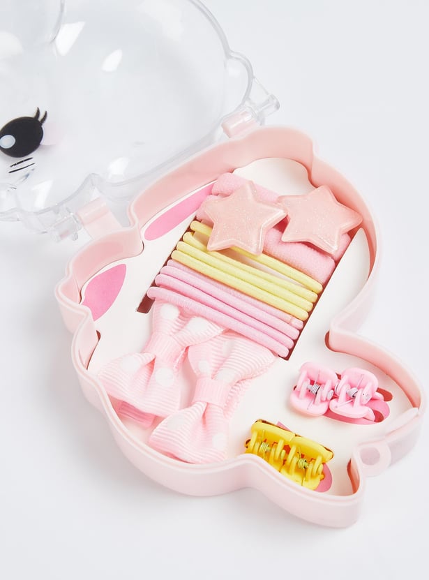 Add vibrant, decorative touches to your hair with this hair accessory set. It comes in a bunny-shaped box for convenience and easy organisation. It includes assorted hair bands, clutch and alligator clips that let you create masterpieces with your hair.