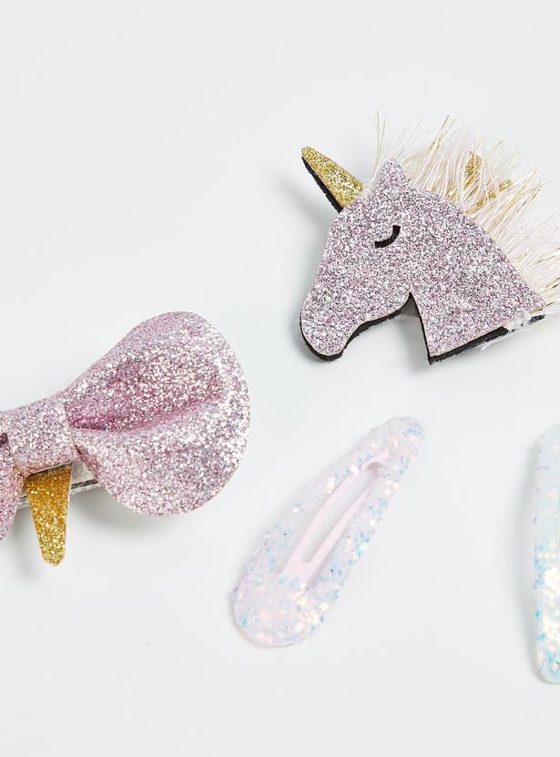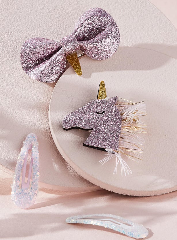 Add sparkly, magical touches to her hair with this set. It includes 2 pairs of sparkly tic tac clips, a unicorn alligator clip, and a bow clip.
