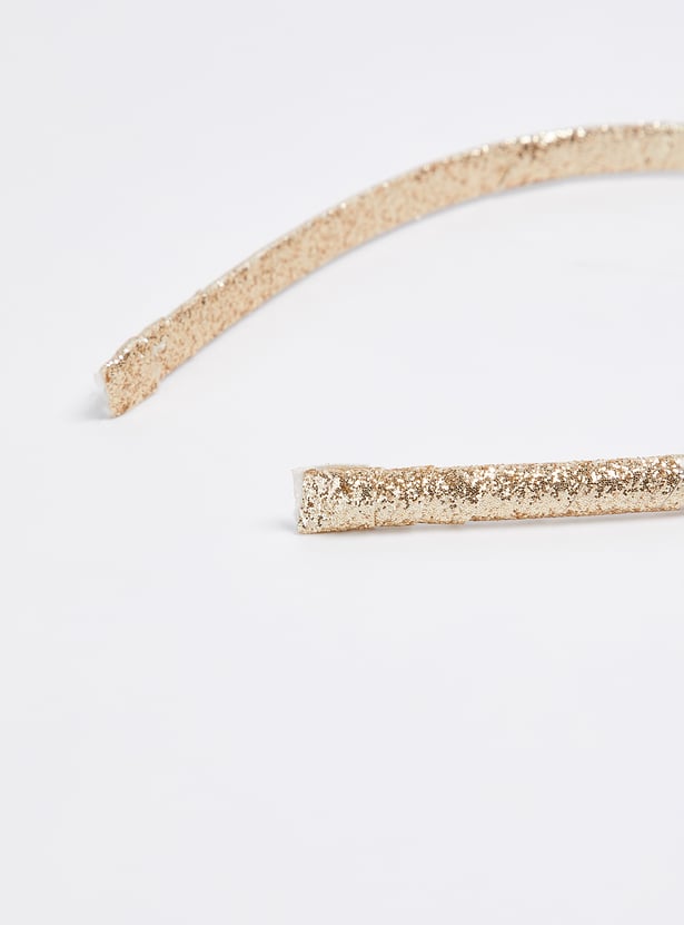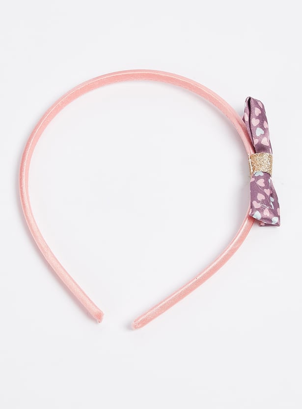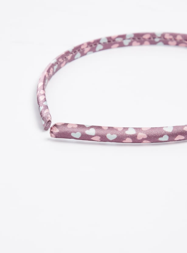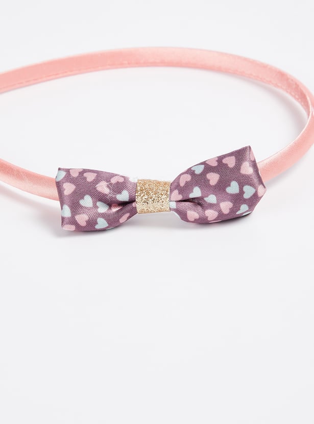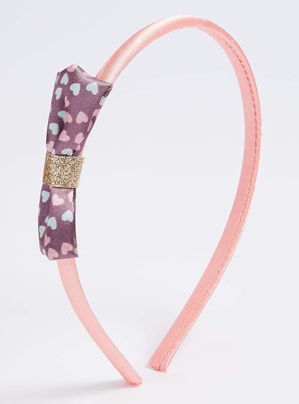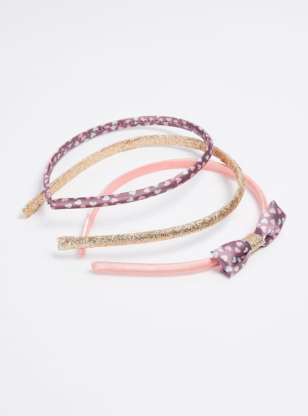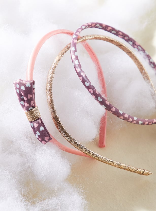 Pretty up her hair with this pack of headbands. It includes a band with a bow accent, a band with heart prints, and a band with a shimmery finish.