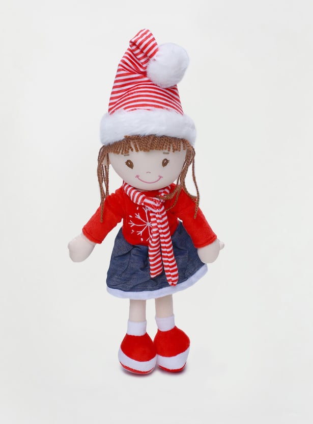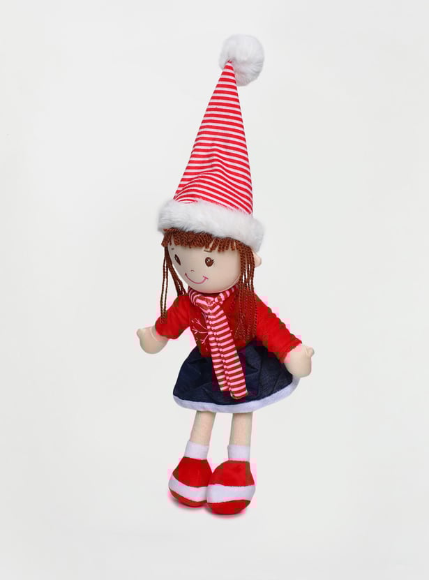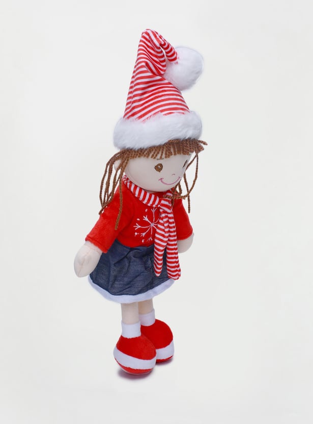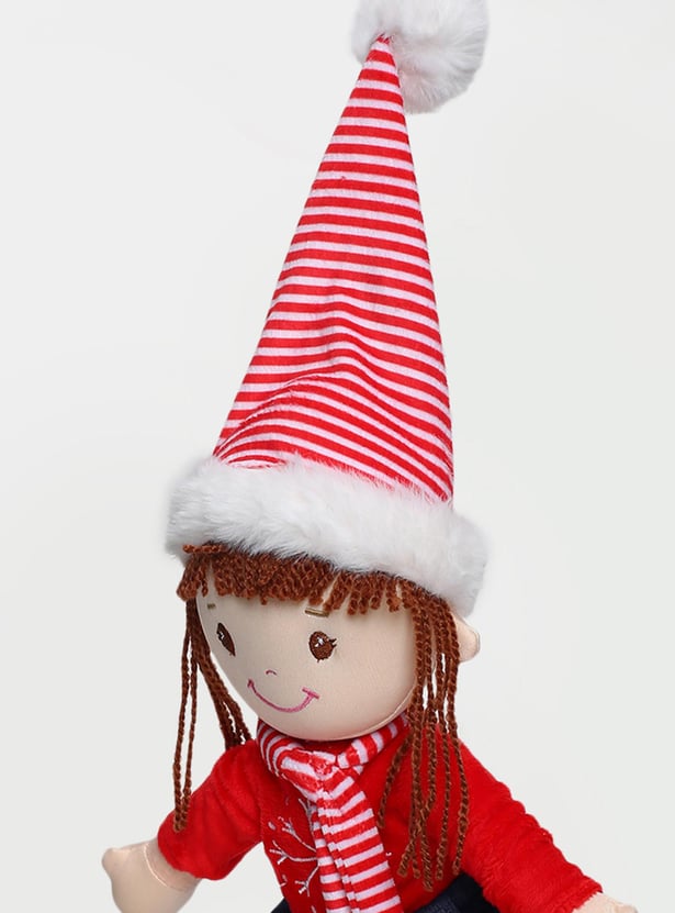 A cute gift for your little one, this doll stuffed toy features a Christmas theme. This plush design comes with a striped cap and scarf for added style.