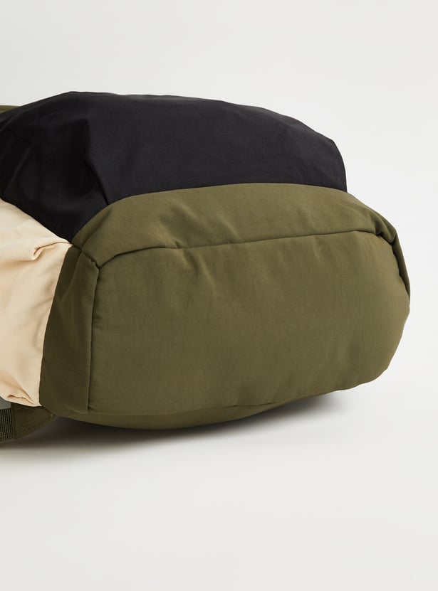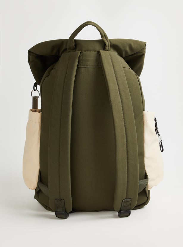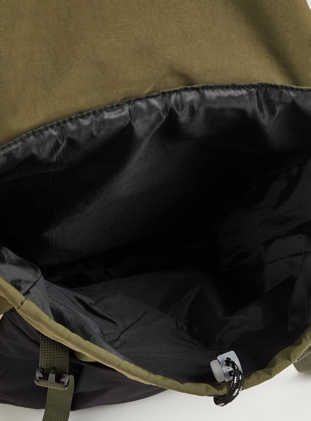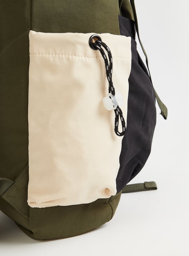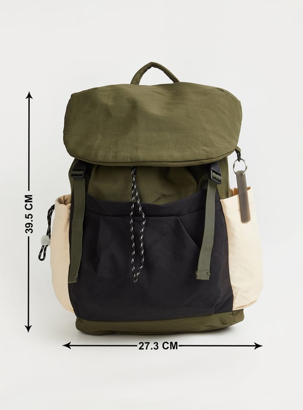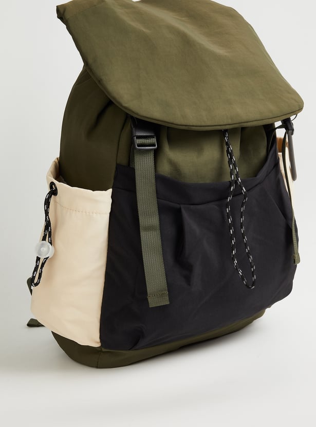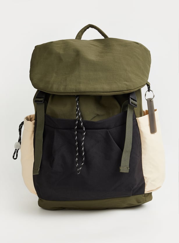 Let your little one carry everything on their adventures with this backpack. It features contrast pockets, a top handle, and backstraps. The flap has a double press buckle and a drawcord that opens to a main compartment.