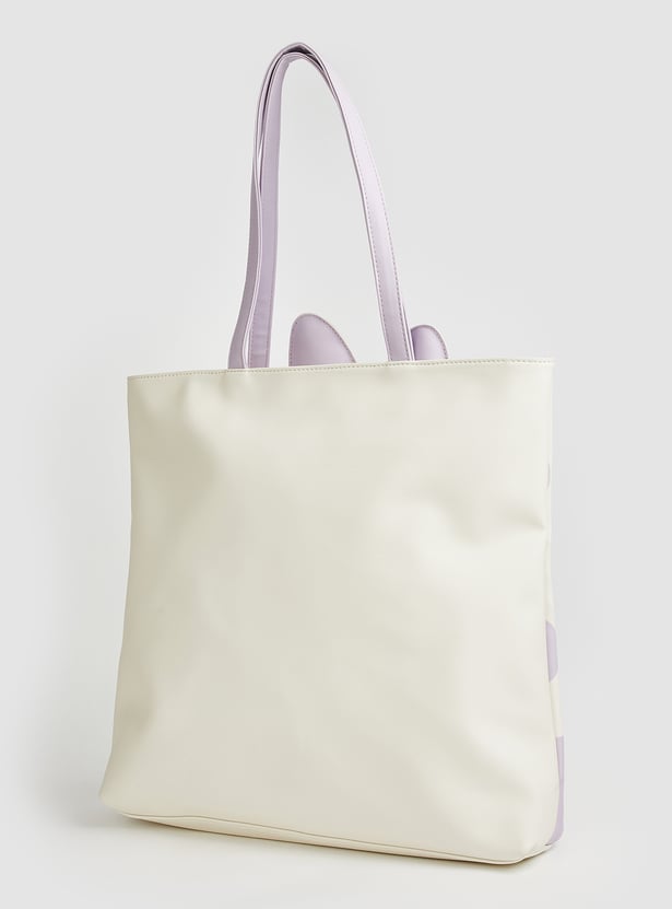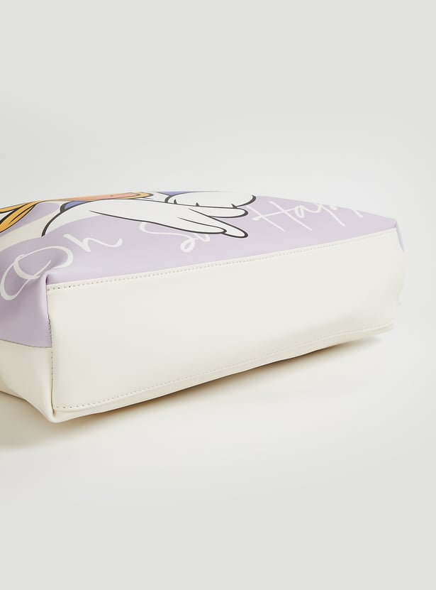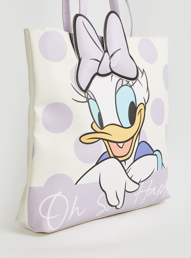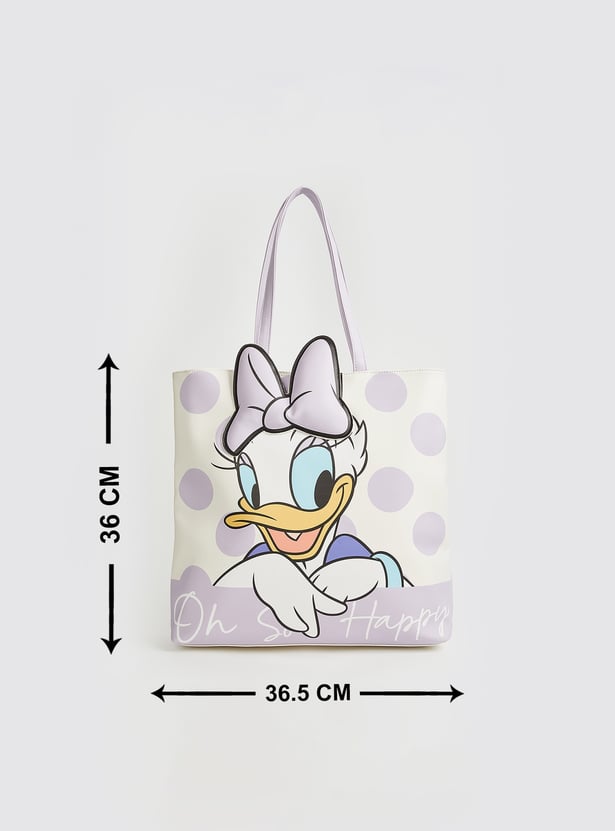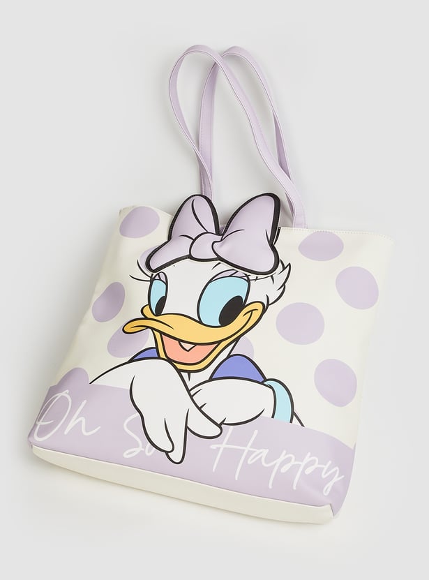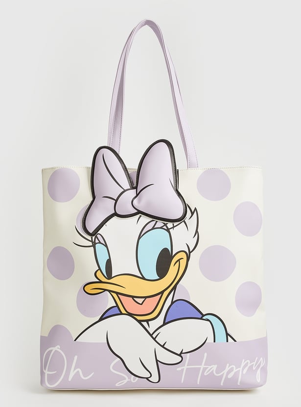 Add a playful pop to your little one's outfit with this cute shoulder bag. It features cheerful polka dots, a delightful Daisy Duck print and an adorable bow embossing on the front. Designed with dual carry handles and a secure zip-top closure, it keeps essentials safe inside the roomy main compartment. An interior pocket helps organise tiny treasures, making it perfect for outings, parties or everyday fun.