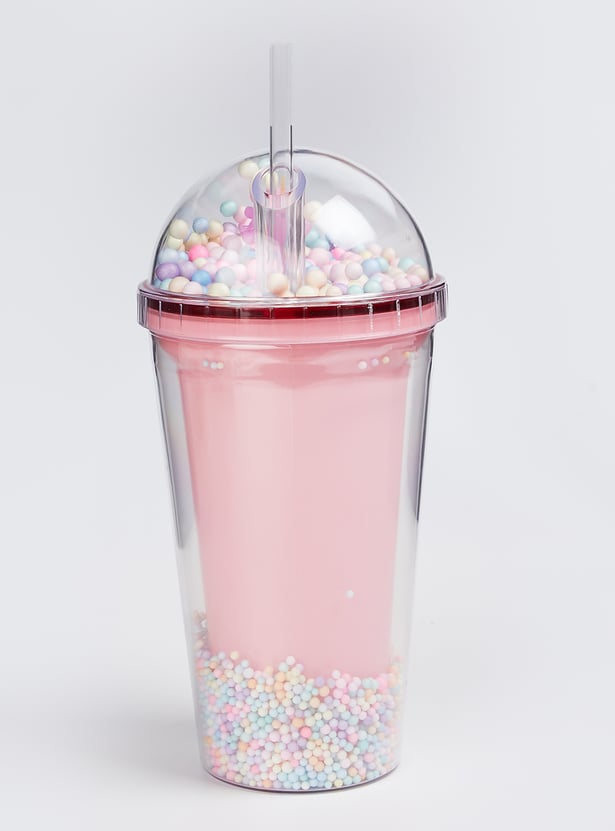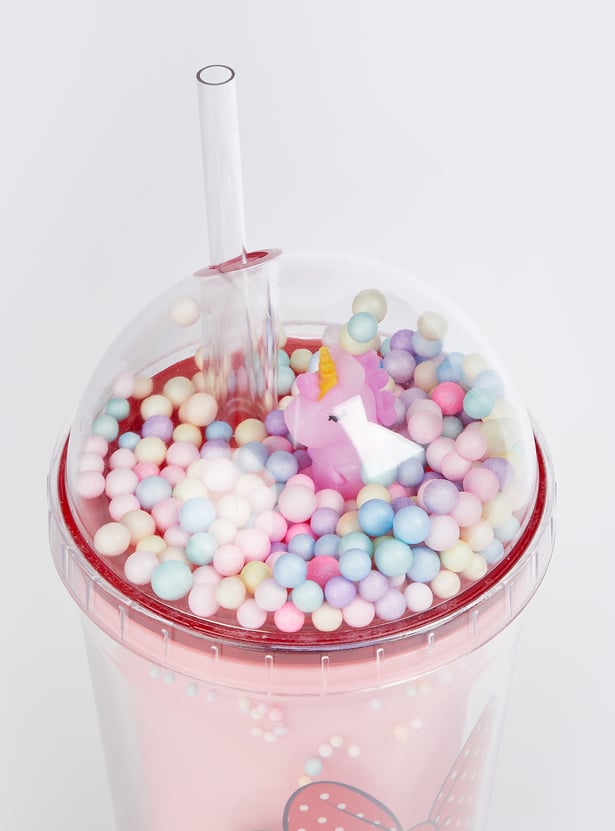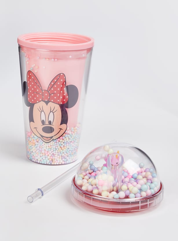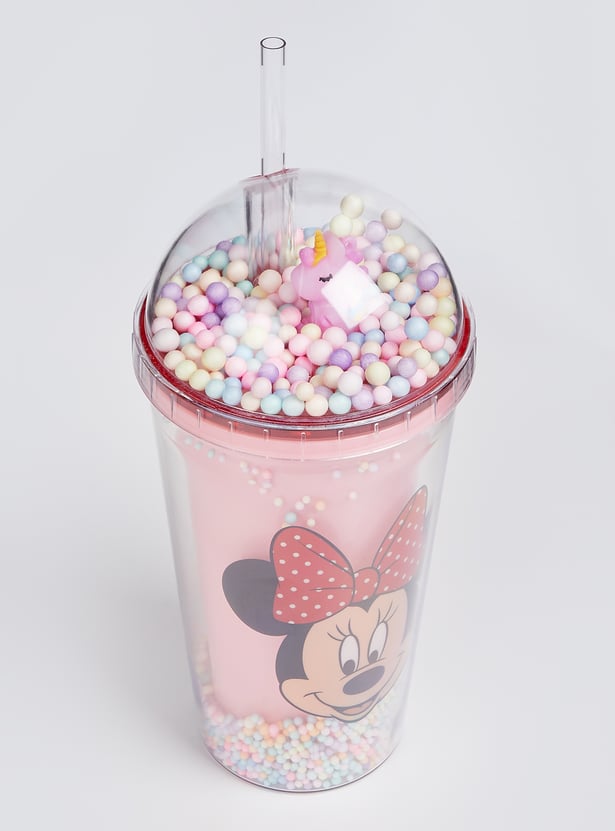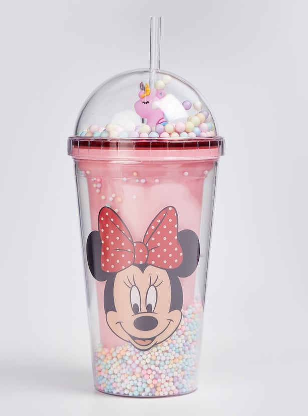 Sip in style with this sipper tumbler featuring a Minnie Mouse print. Featuring a whimsical thermocol accent, it comes with a cute unicorn lid and a straw, making hydration exciting.