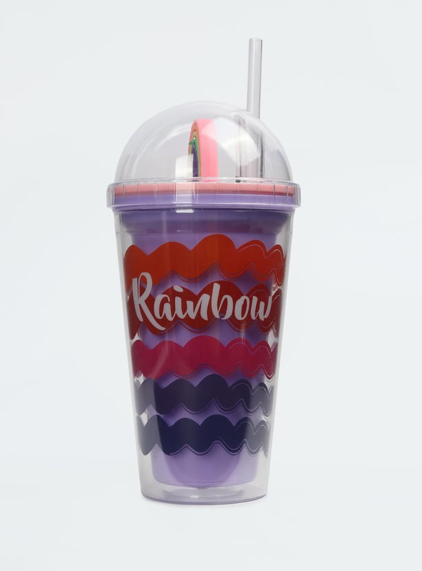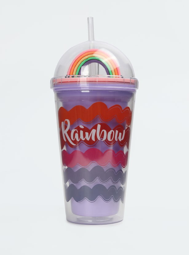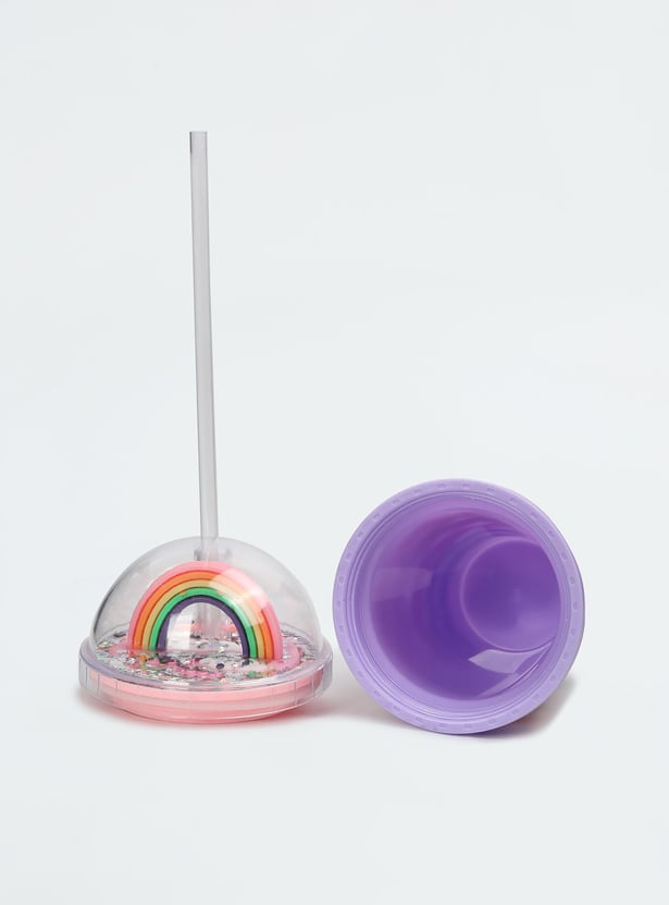 Add an element of fun to your little one’s day with this tumbler. It has a tumbler with a cap and straw. The rainbow-themed design and confetti accents provide added style. This tumbler is made of BPA-free material.