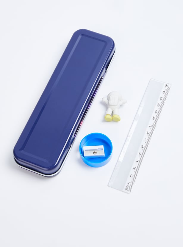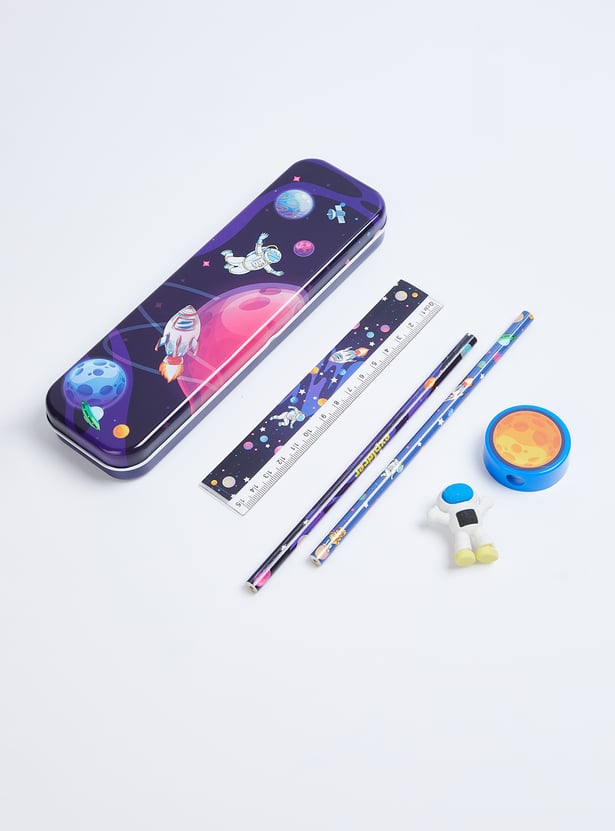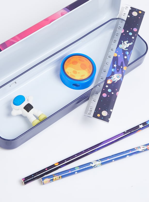 Brighten up your study time with this stationery set featuring a space print pencil box. The set includes 2 pencils, 1 eraser, 1 sharpener, and 1 scale, all designed with vibrant, fun details.