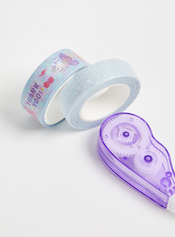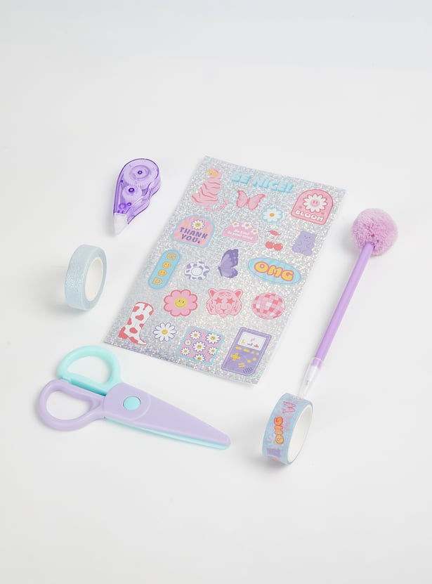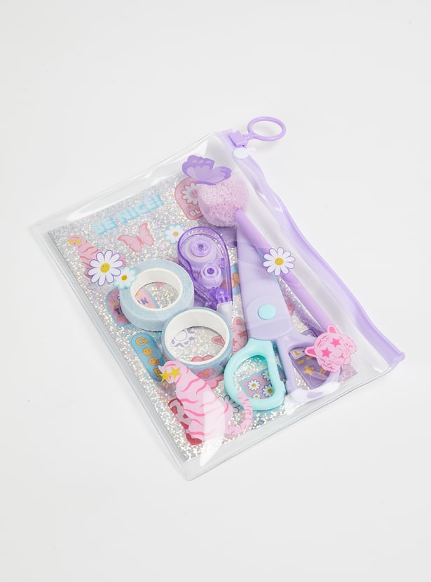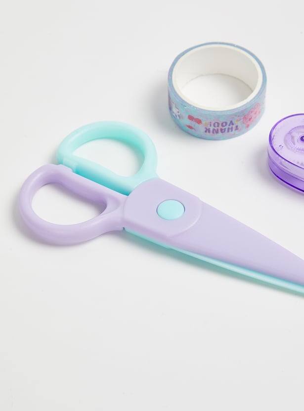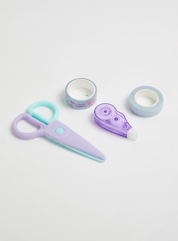 Organized and handy, this stationery set includes two tapes, one correction pen, one pencil, one pair of scissors, and a pouch to keep everything neatly stored. With its practical mix of essentials, it’s perfect for school, office, or creative projects.