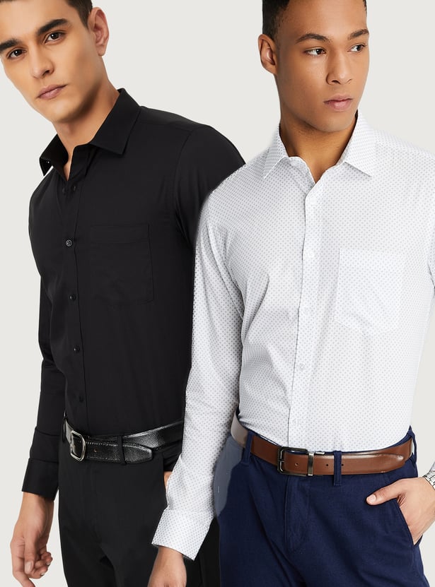 Elevate your formal wardrobe with this pack of shirts designed for a refined look. Featuring one solid and one printed style, both include a spread collar, full sleeves, a button placket, patch pockets, and a curved hem.