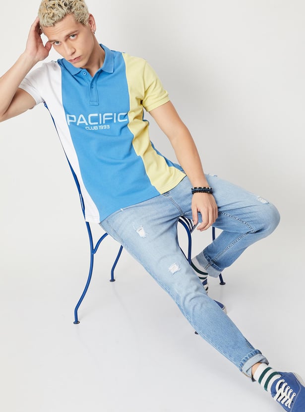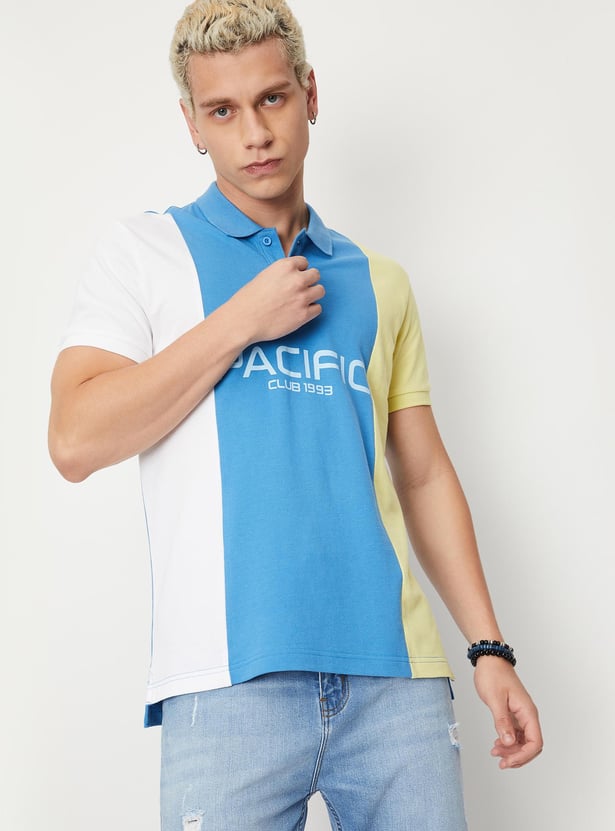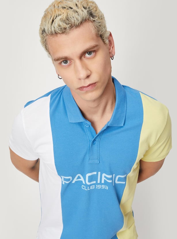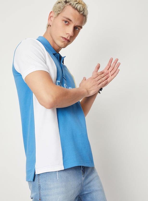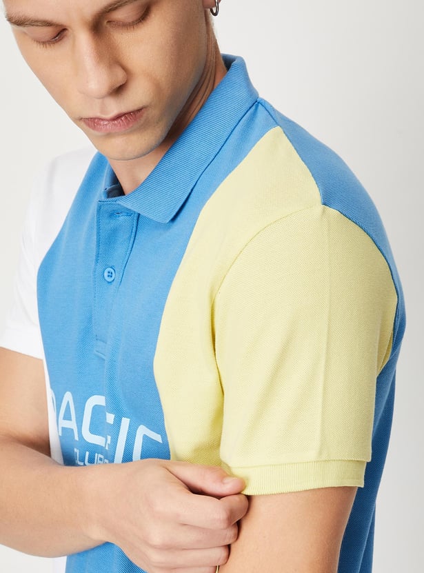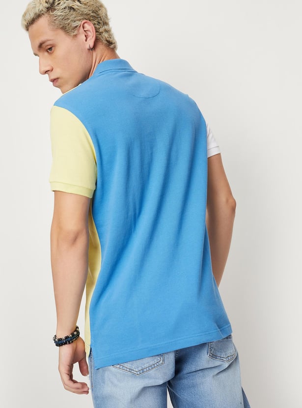 Get your casual collection to the next level with this polo t-shirt. It features a colourblocked surface, polo collar, half sleeves, and a button placket. Make a difference by teaming it up with a pair of jeans and lace-up shoes.