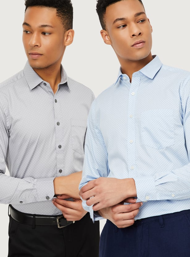 This pack of printed formal shirts features a spread collar, button closure, patch pockets and full sleeves.