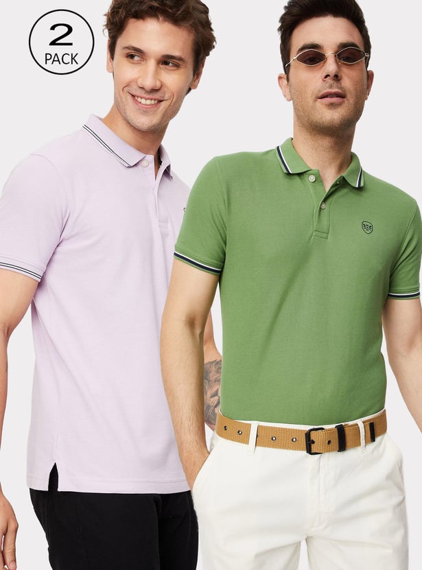 Elevate your everyday style with this pack of two solid polo T-shirts, crafted to deliver timeless appeal and effortless comfort. Designed with a refined polo collar, smart button placket, striped accents on collar and sleeves, and easy half sleeves.