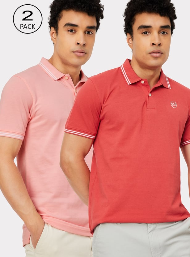 Elevate your everyday style with this pack of two solid polo T-shirts, crafted to deliver timeless appeal and effortless comfort. Designed with a refined polo collar, smart button placket, striped accents on collar and sleeves, and easy half sleeves.
