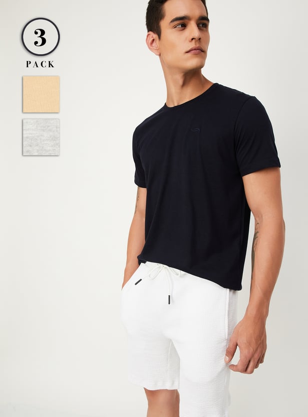 This pack of three solid t-shirts is a must-have for your everyday wardrobe. Featuring a classic crew neck and half sleeves, these tees offer unmatched comfort and versatility. Crafted for durability and style, they are perfect for layering or wearing solo.
