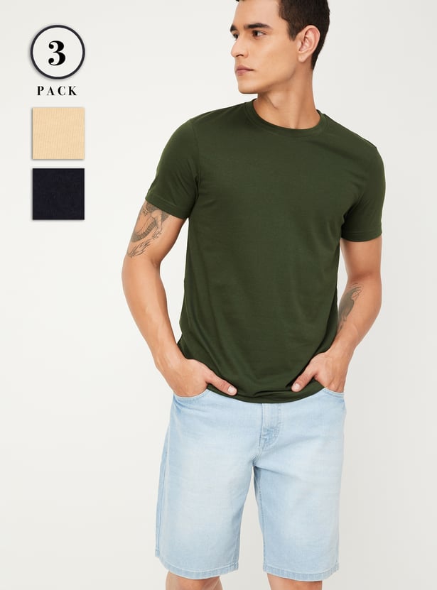 This pack of three solid t-shirts is a must-have for your everyday wardrobe. Featuring a classic crew neck and half sleeves, these tees offer unmatched comfort and versatility. Crafted for durability and style, they are perfect for layering or wearing solo.