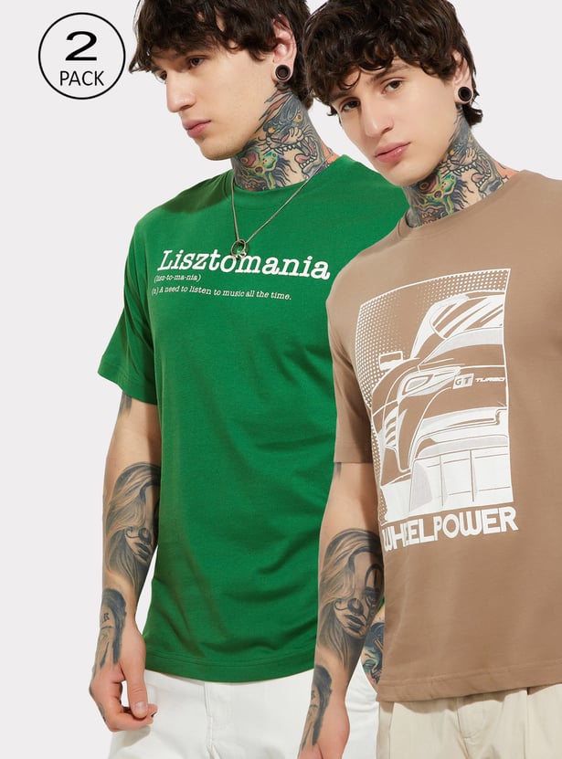 A pack of two printed T-shirts featuring a classic crew neck and comfortable half sleeves for everyday ease. The mix of prints brings subtle variety to casual wardrobes, making this combo ideal for outings, downtime, and off-duty wear.