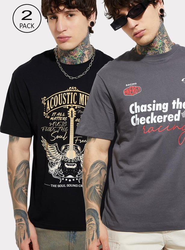 Elevate your casual collection with this pack of 2 printed T-shirts. Designed with a classic crew neck and half sleeves, they bring together everyday comfort and stylish prints for versatile wear.