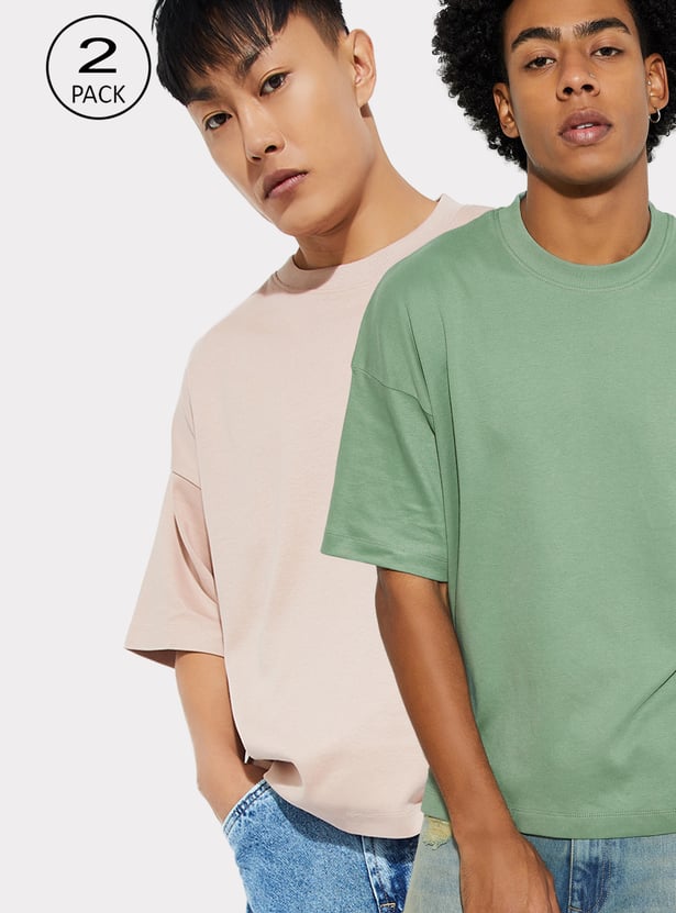 This pack of 2 men’s solid oversized T-shirts features a classic crew neck and half sleeves, offering an effortlessly cool and relaxed fit for everyday wear.