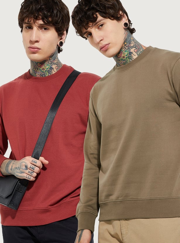 Stay comfortable and stylish with this solid sweatshirt in a pack of 2. Featuring a classic crew neck and full sleeves, it offers a timeless design. The ribbed detailing along the neckline, cuffs, and hem adds subtle texture and enhances its appeal.
